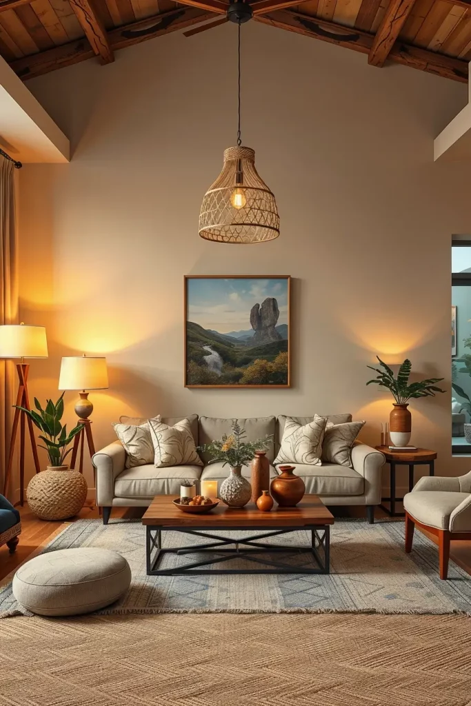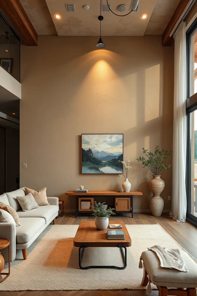 I select these objects deliberately, so that they do not compete with the already existing shapes and tones. A driftwood sculpture, a ceramic bowl with a matte finish or a woven wall hanging with texture can help add depth without making the space look disjointed. Here lighting is important as well, I tend to use lamps with linen shades and warm bulbs to give a soft glow to complement the natural palette.