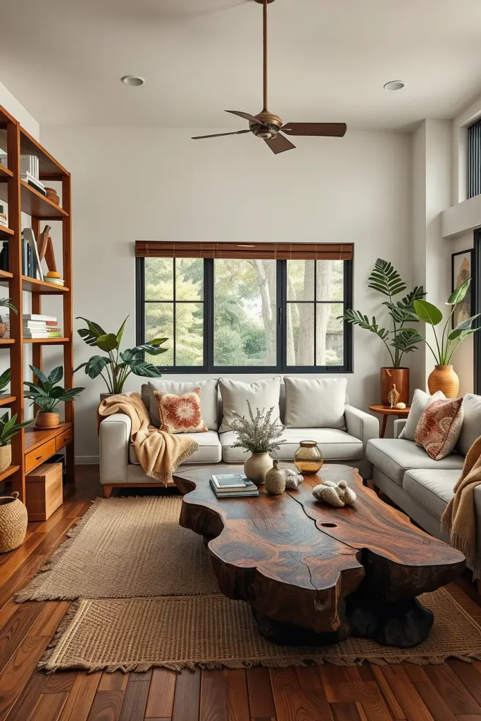 The charm of a living room that has organic forms and natural coloring is that it combines modernity and nature. I will tend to mix modern, smooth sofas with raw wood tables or modern metal lamps with rattan shades. This contrast gives a layered effect that is curated and accessible.