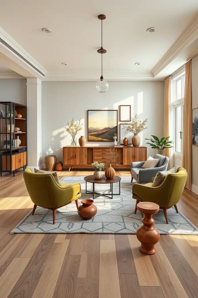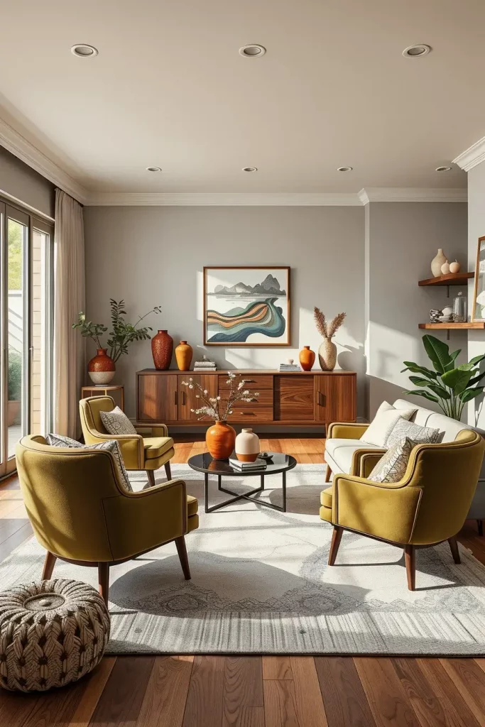 I have applied a layered effect in my own projects with olive-green accent chairs, terracotta vases, and stone-gray rugs. Warm walnut sideboards or ash shelves in the sideboard, complete the overall harmony and remain within the earthy palette.
