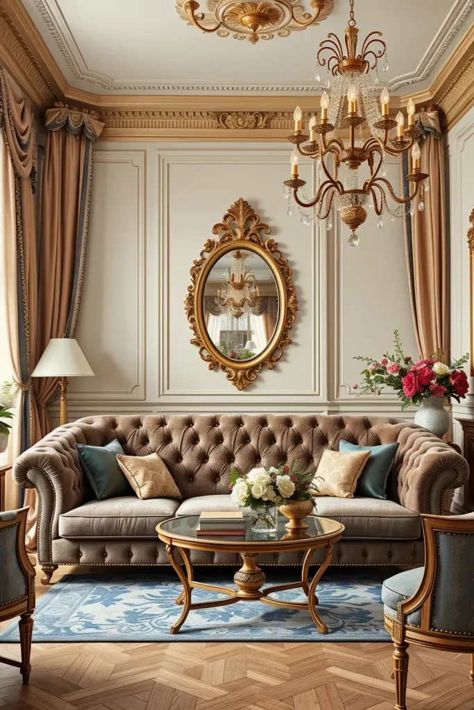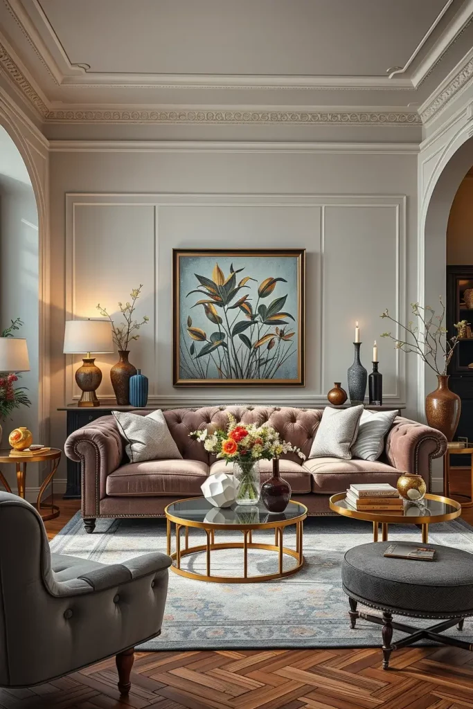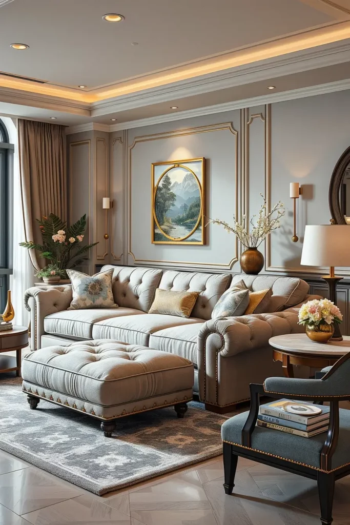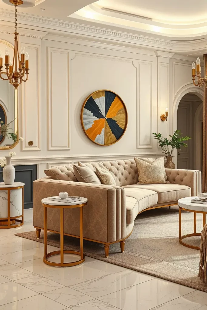 When I create interior designs with such sofas, I match them with soft neutral tones, creamy whites, taupes or blush-colored. This method enables the metallic accents to be jewelry-like elements in the room. They should be accompanied by similar gold-framed mirrors or even by brass lighting fixtures to complete the luxurious and cohesive modern look.