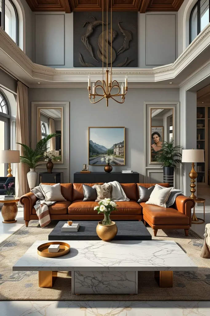 I use symmetry when decorating such rooms, having the same accent chairs, tables, and tall lamps on both sides of the sofa. These works do not only balance the grandeur but also establish the luxury interior design the identity of the house.