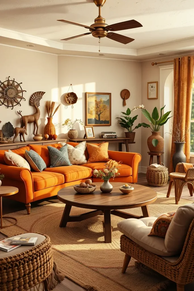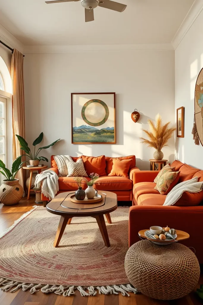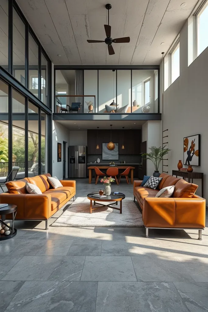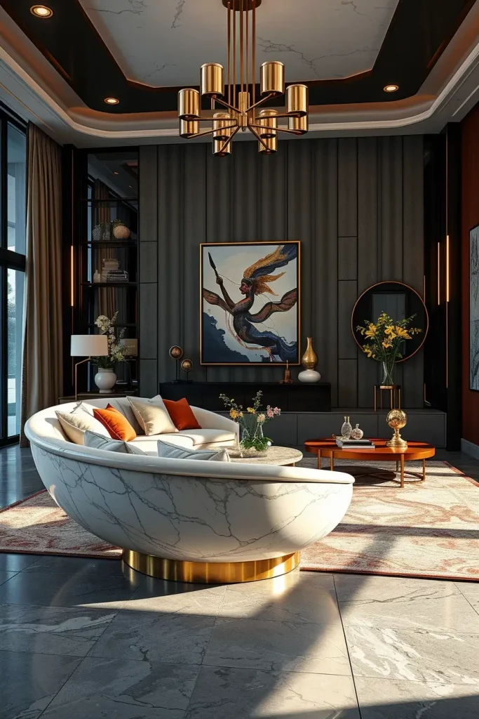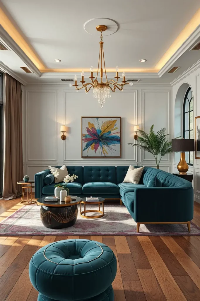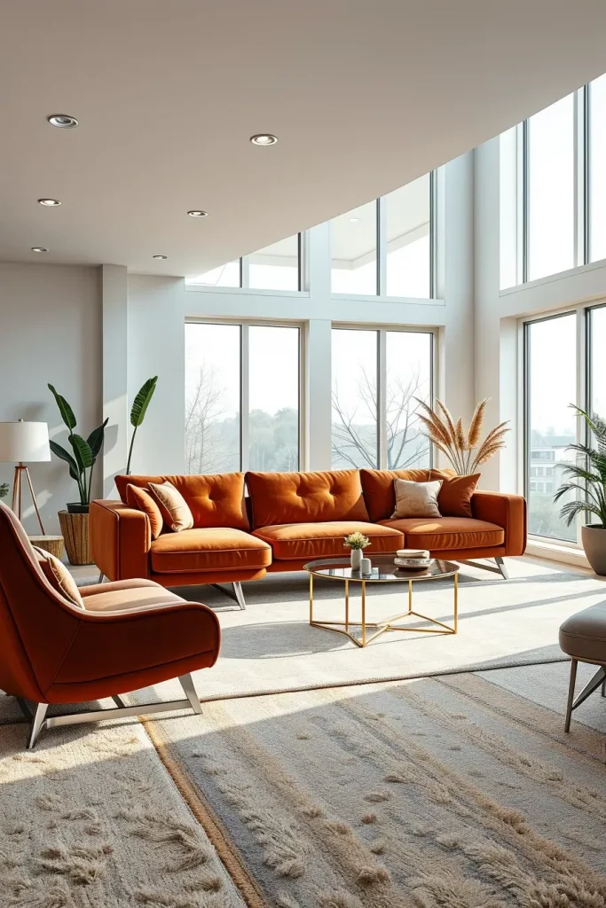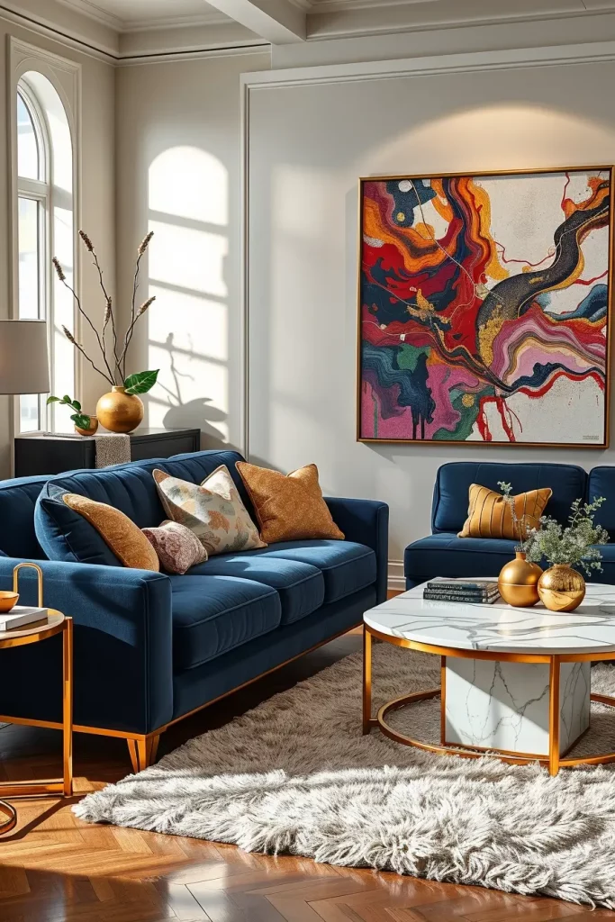 Colorful sofas should be balanced with the neutral architectural elements where I tend to design vibrant interior using color in designing sofas. There is a deep blue velvet sofa, which combines well with ivory walls and brass fixtures. I also play around with contrasts- I have a rust-orange sofa and cool marble floors to bring about movement and dynamism.