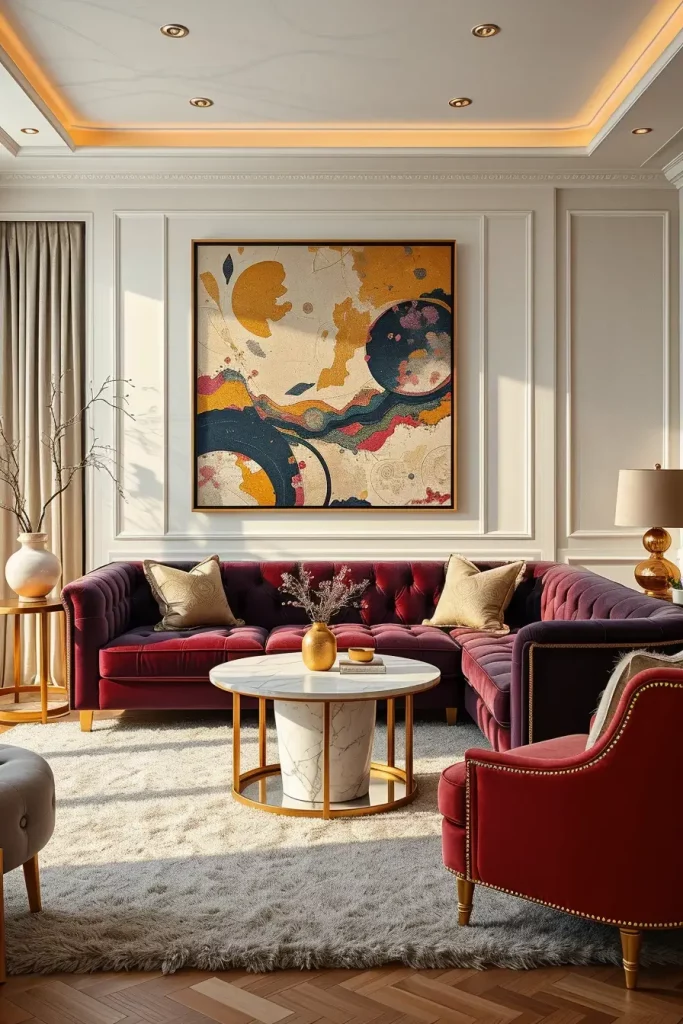 To take this appearance to the next level, I would add big abstract wall paintings as well as the use of gold-framed lamps. These impeccables augment the plush comfort without pushing the softness of the furniture design per se.