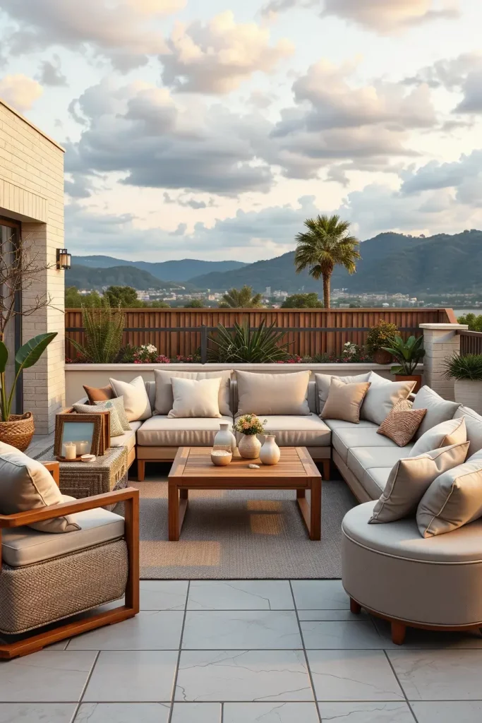 To boost these spaces I combine the sofas with low teaks coffee tables, ceramic vases and soft outdoor lighting. Fabrics and cushions are textured and weatherproof to increase the level of comfort without losing its elegance.