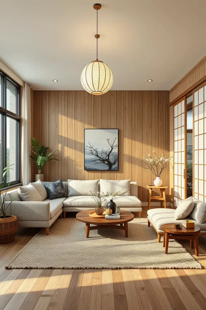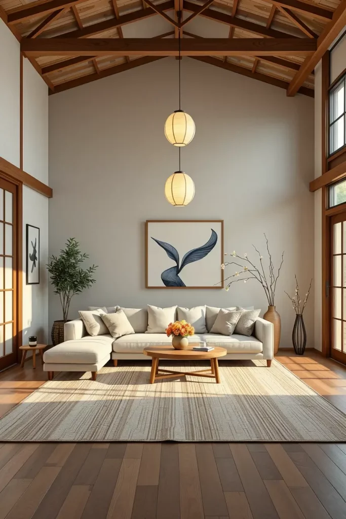 I would supplement this interior with lighting from paper lanterns, bamboo side tables, and area rugs made out of tatami to further enhance the theme of the natural and balance.