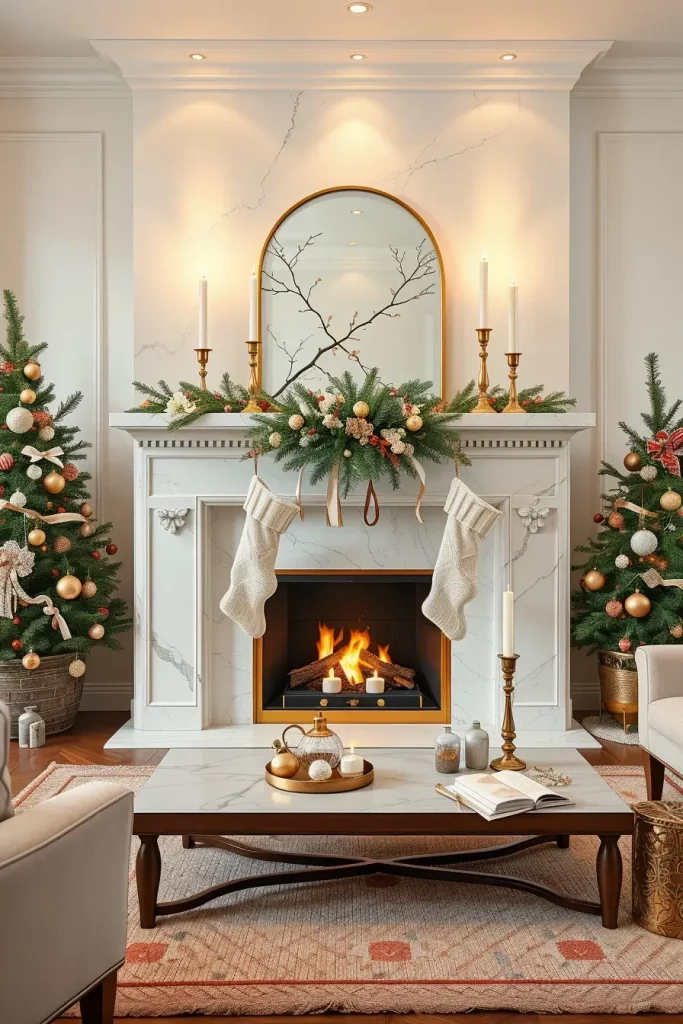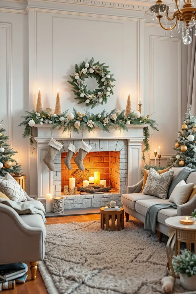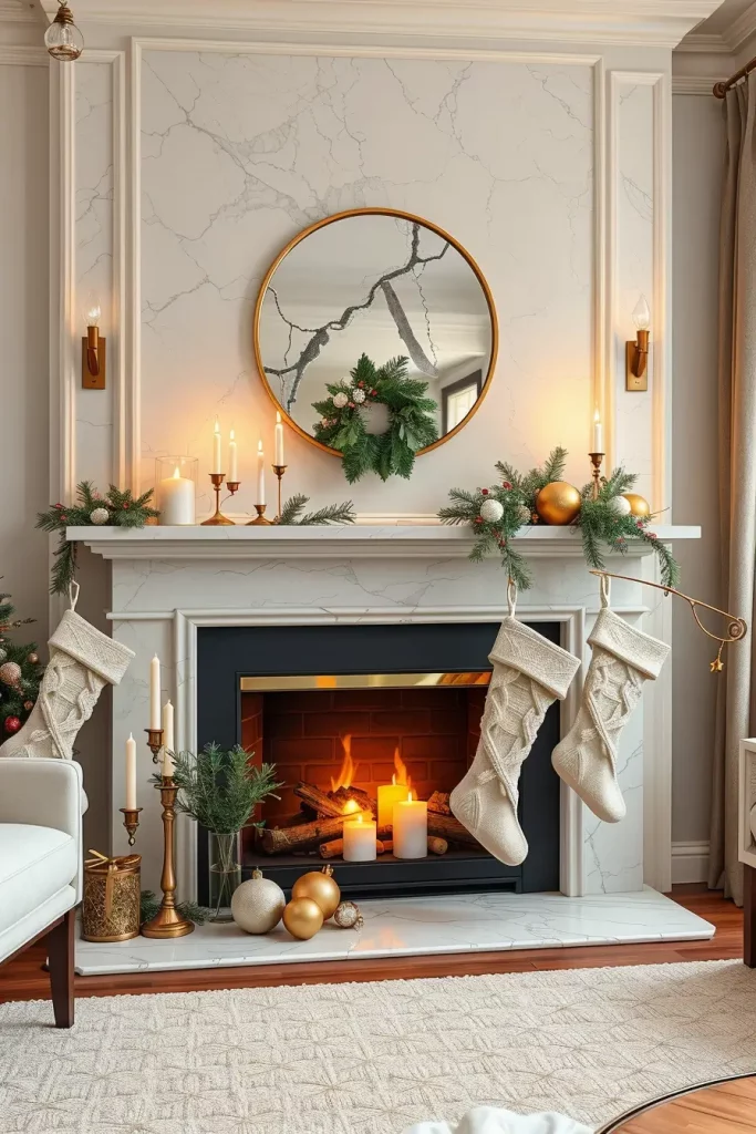 In this case, I would recommend a smooth marble or stone fireplace, and that is enhanced with a soft gold candleholder, glass decor, and ivory knit stockings. Not too complicated mirror or painting over the mantle adds symmetry and depth to the image. Lighting must be soft and cozy, which is done with the help of LED candles or a lamp placed near.