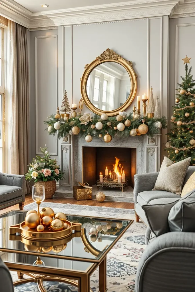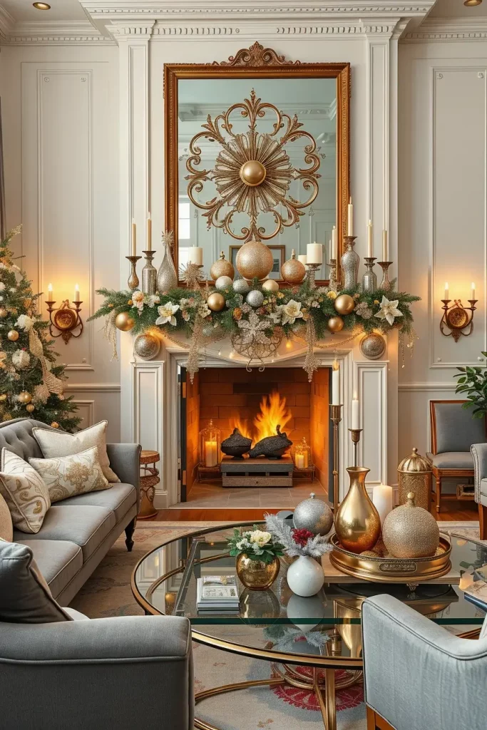 Designed gold and silver mantle Christmas decor, I am concerned with elegance and reflexion. This style is very effective in open areas or living rooms where the walls are of neutral colour because it is not heavy. Mirrored trays, gold candleholders, silver decorations and tracery are all necessities in capturing soft light and glistening.