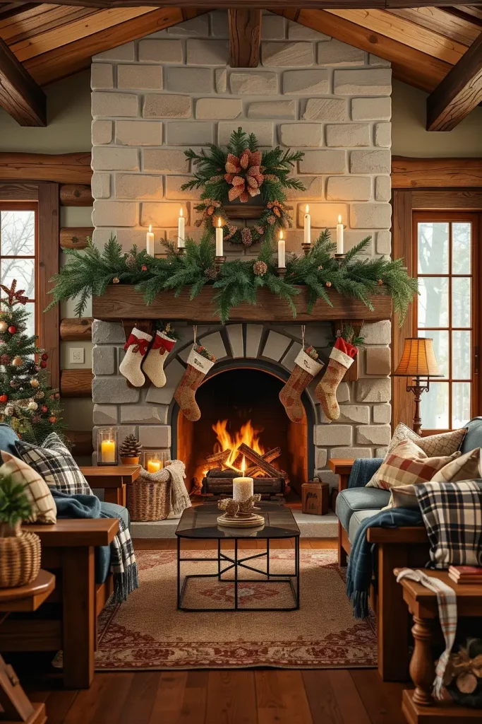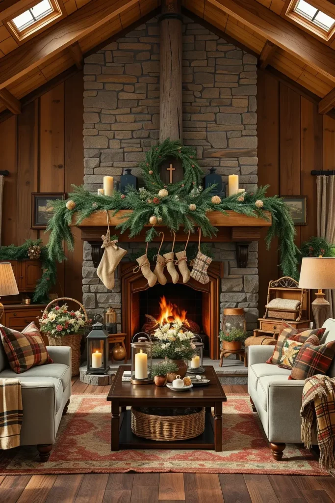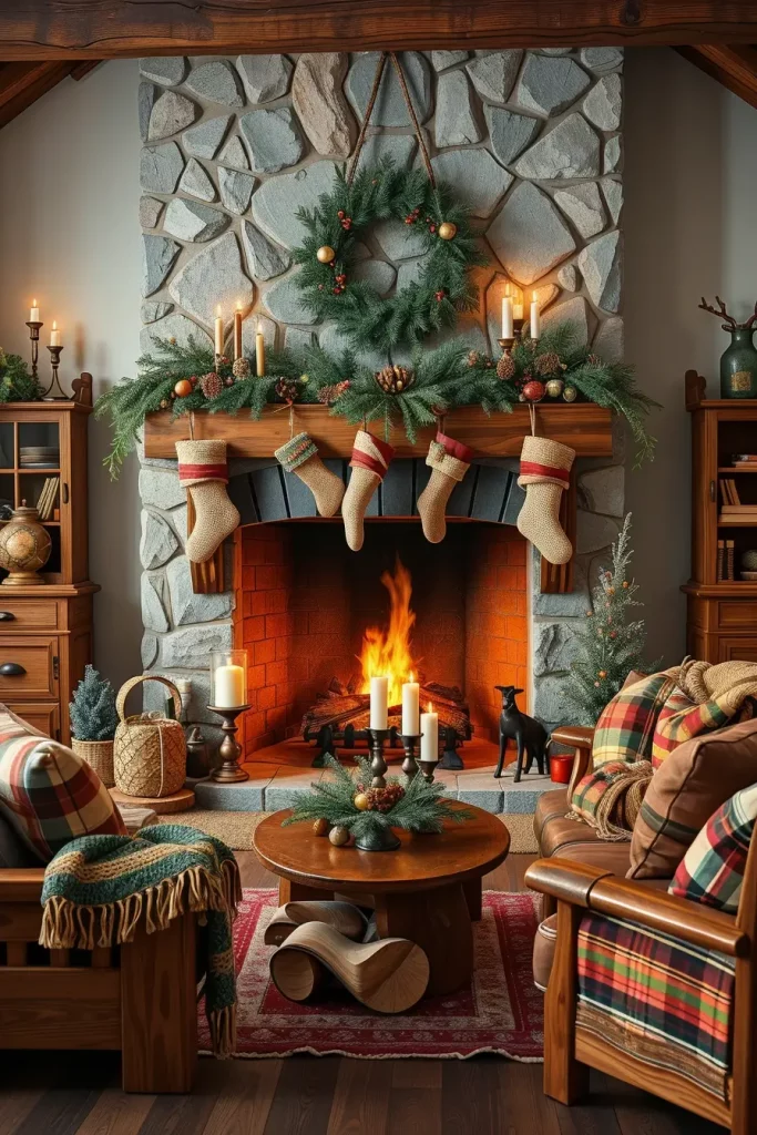 I would throw green garlands, birchwood candleholders and woven stockings over the mantle. Incorporation of reclaimed wood furniture e.g. a coffee table or side board helps to strengthen the rustic style. The picture is finished with soft plaid blankets or wool throws that are thrown around the place.