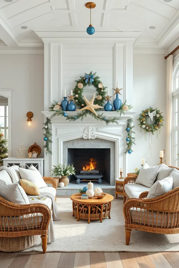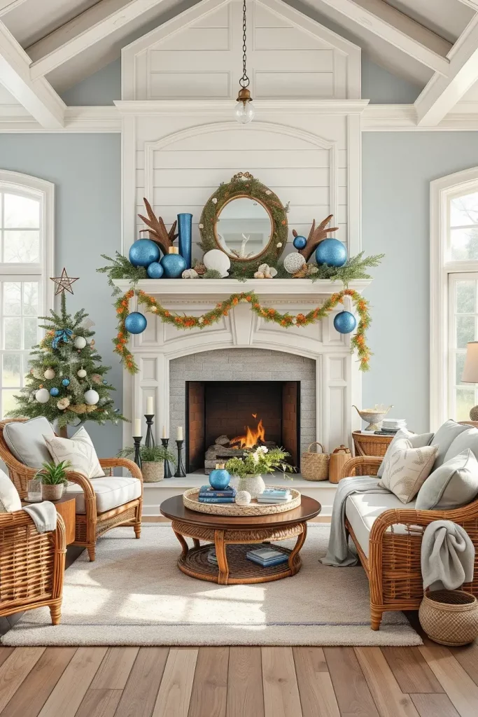 Coastal Mantle Xmas Decor with Blue and White Hues