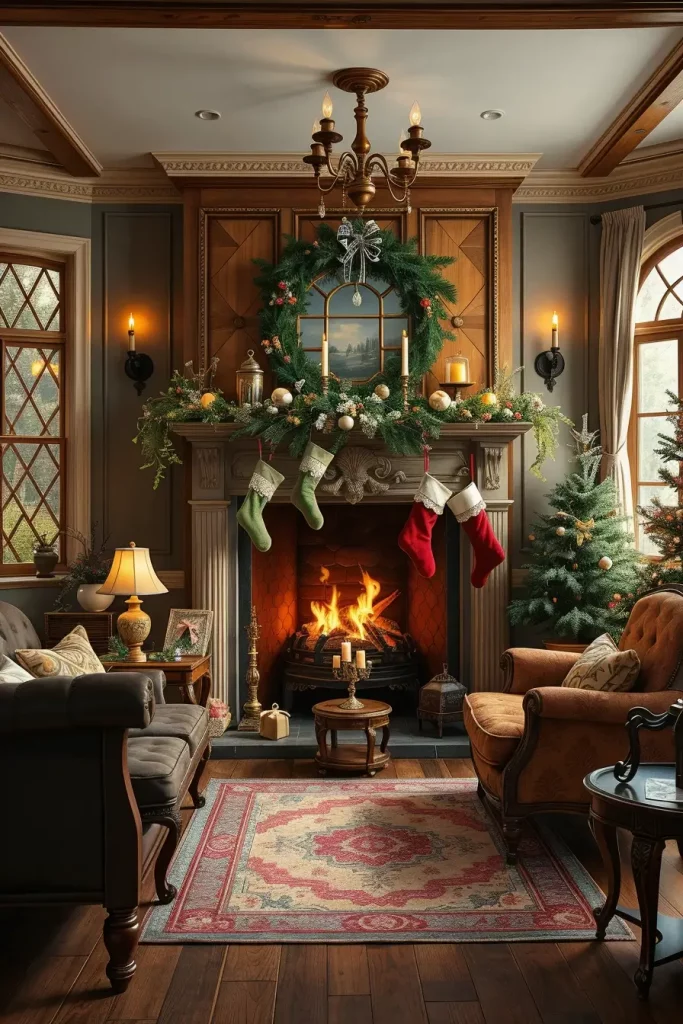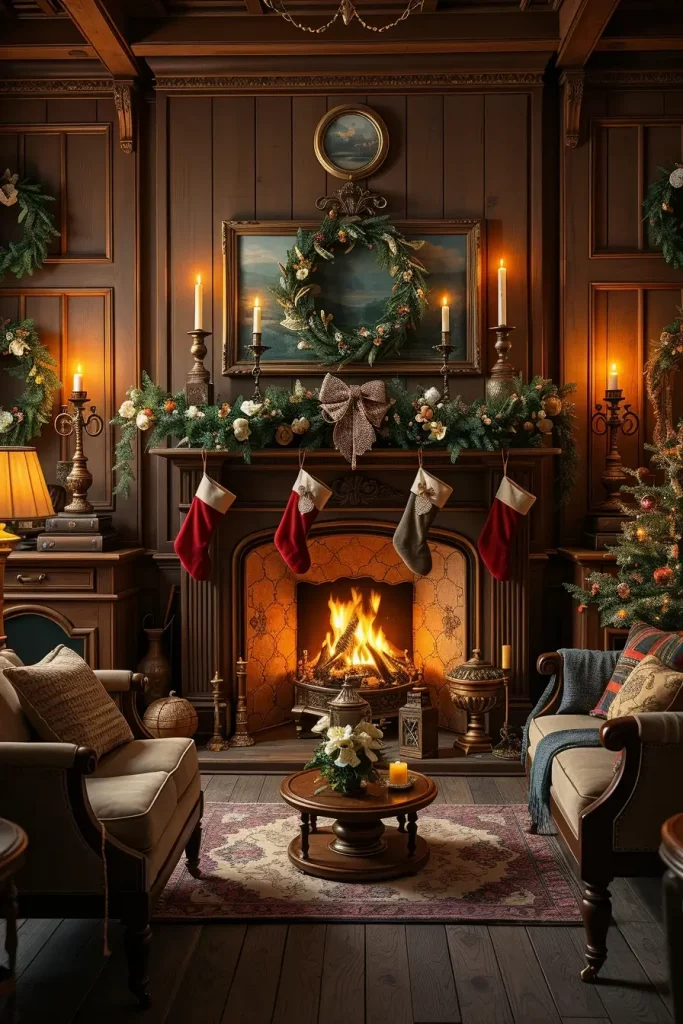 I offer rich wood furniture and warm lighting to maintain the appearance of the look. The fireplace is surrounded by an armchair of classic style, framed pictures above the fireplace, and the soft curtains add to the holiday atmosphere. Whimsical personality is introduced by small figurines or nutcrackers on the edge of the mantle.