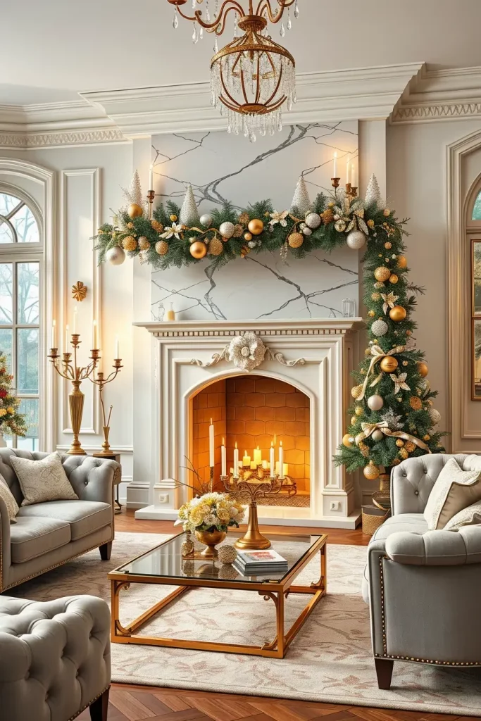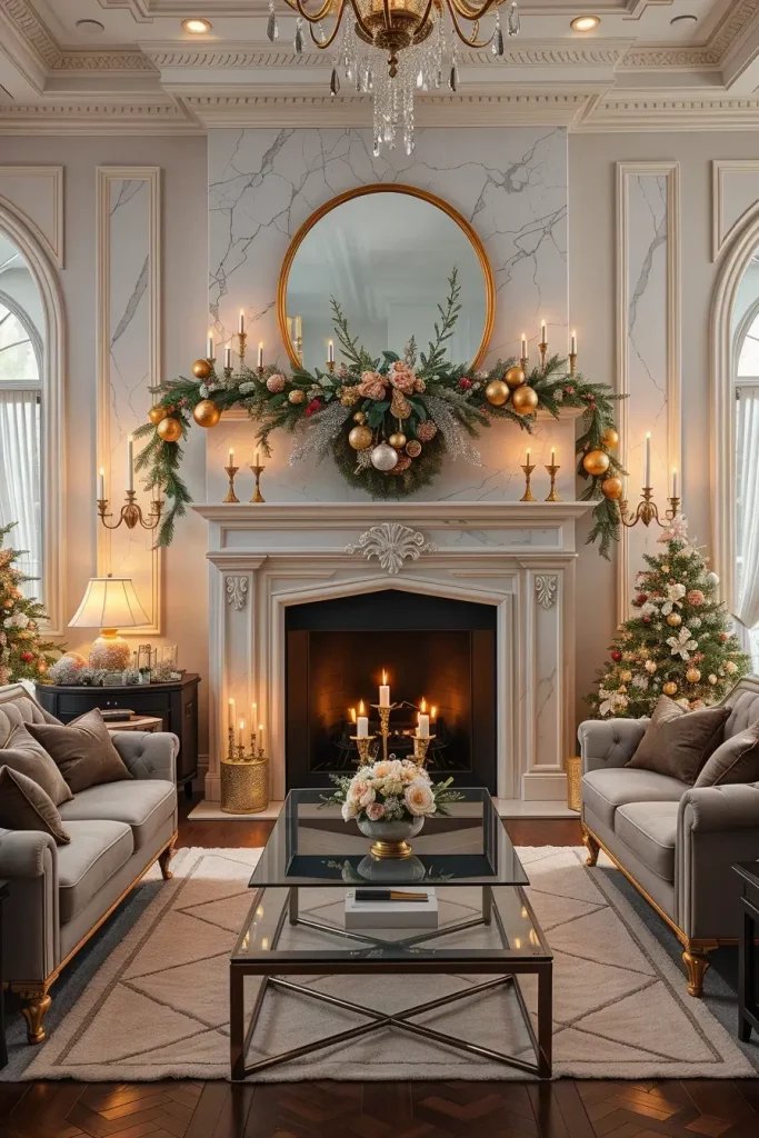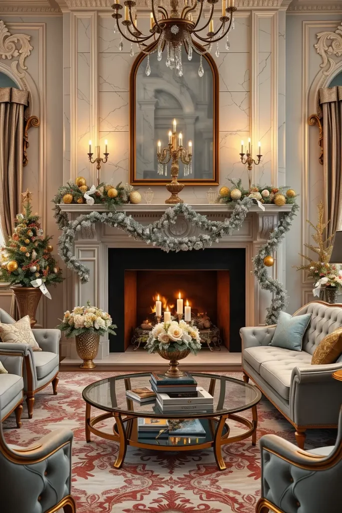 In this design, I would work with a mirrored or marble fireplace, metallic garlands, crystal candleholders, and big ornaments. Sophistication is highlighted by addition of other pieces of furniture such as tufted sofas, glass coffee tables and satin cushions. The whole room must be dimly lit.