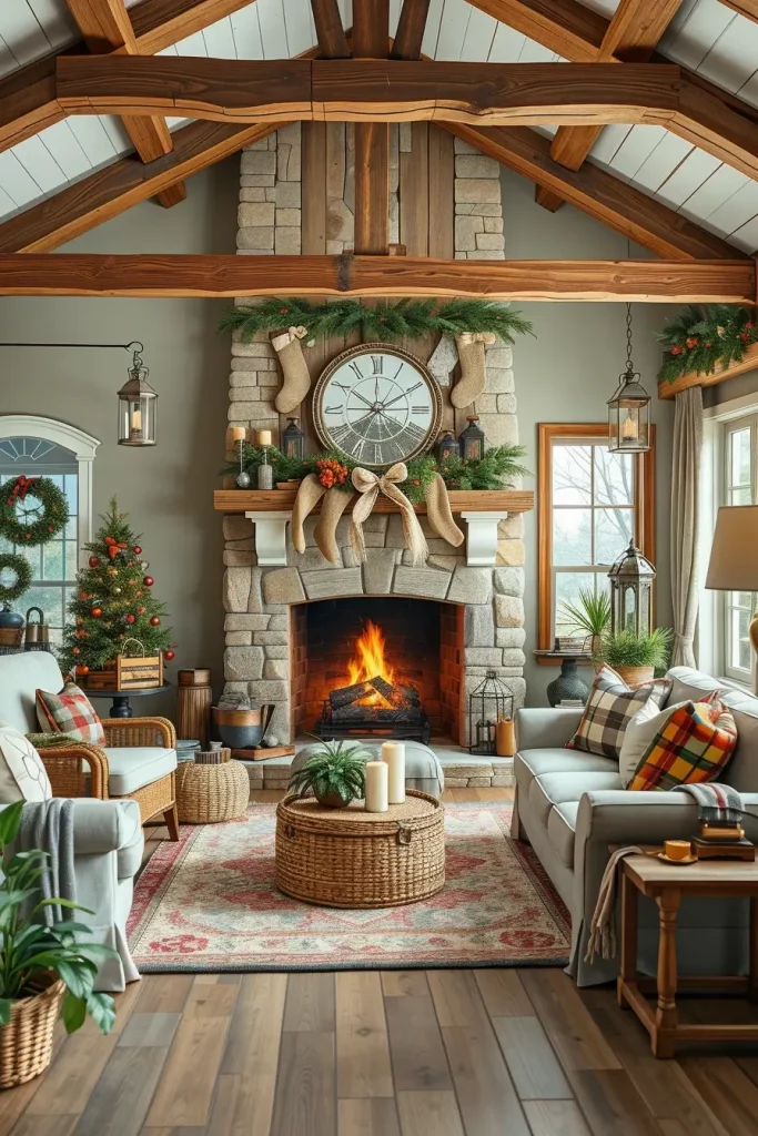 It is a perfect base to a wooden beam fireplace. I combine pine garlands, burlap stockings and small wooden figurines to create texture. Instead, rustic lanterns or old signs may be bought on either side of the mantel to add the farmhouse flavor. The welcoming atmosphere is finished with neutral-colored furniture, plaid pillows, and large knitted throws.
