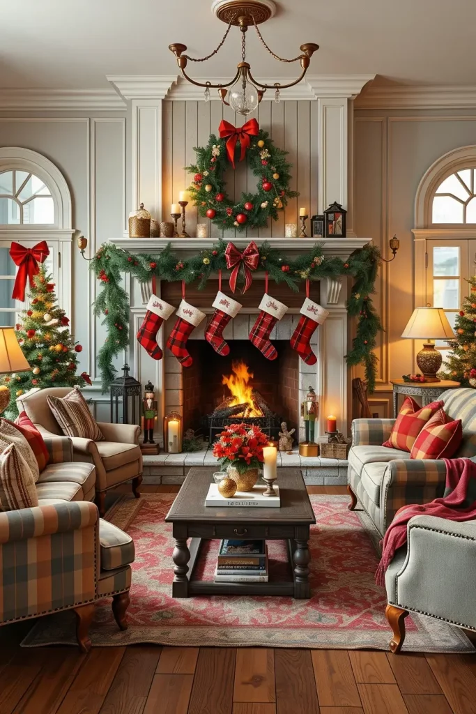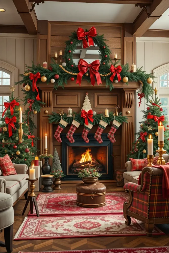 This is complemented with furniture such as dark wood coffee tables or old fashioned wingback chairs. To decorate it I suggest plaid stockings, brass candleholders and a wreath over the mantle also to reflect the same color scheme. The visual harmony is finished with several covered packages of gifts in the same color on the fireplace.