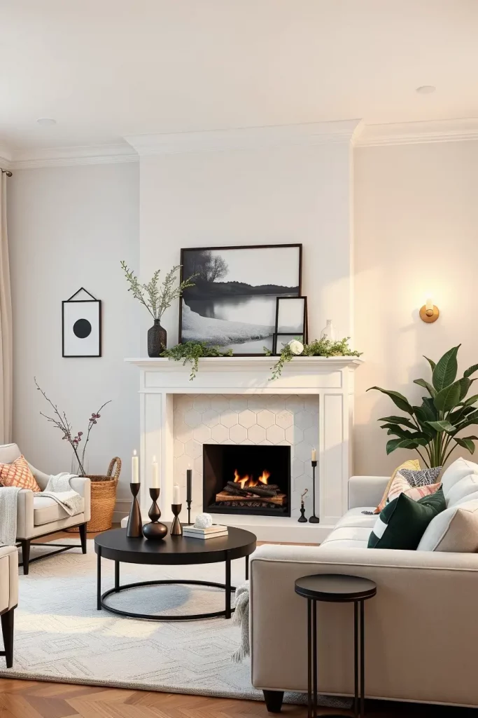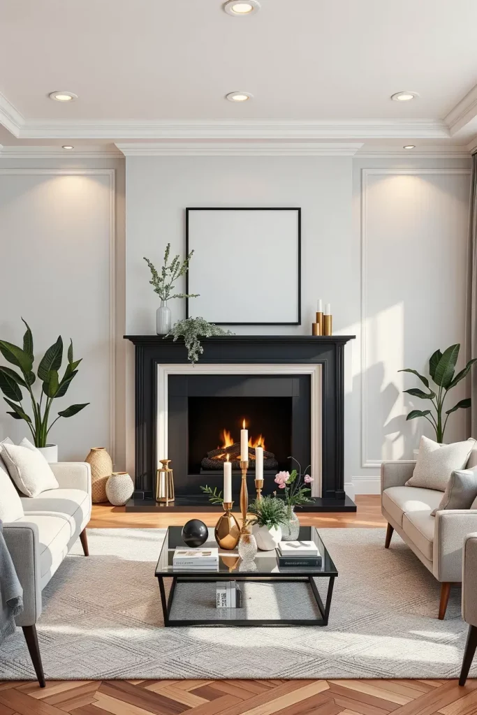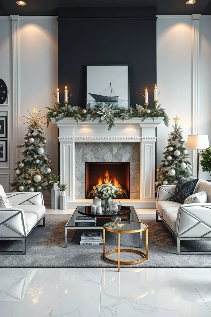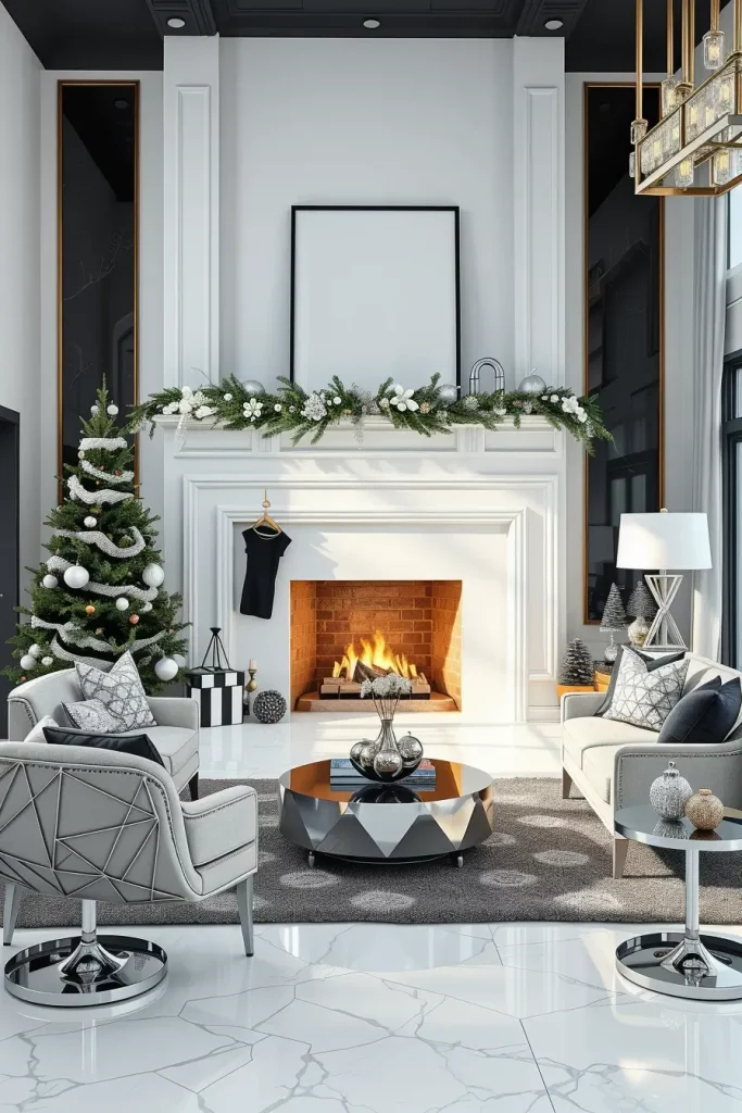 In the case of furniture, I would suggest neutral gray modular seating, glass or chrome decorations, and minimalistic geometric forms. Even the mantle itself may include matte black candleholder, white garlands, and some silver suggestions.