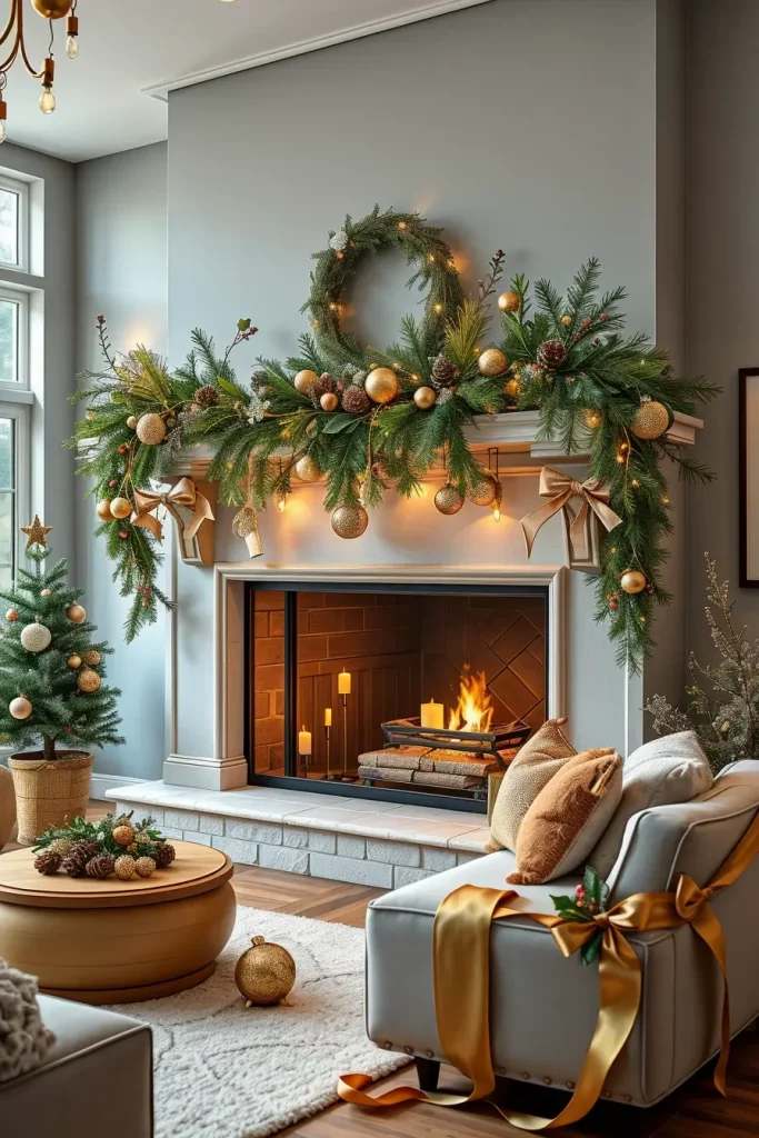 I would then cover the mantle with the garland asymmetrically draped to add gold ornaments, pinecones, and satin ribbons to finish the design. The low-key lighting is a comfortable illumination which adds to any living room decor and matches well with the both vintage and contemporary interiors. It is all about combining nature with metallic details to achieve a refined 2025 appearance.