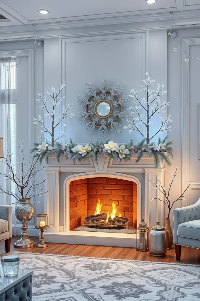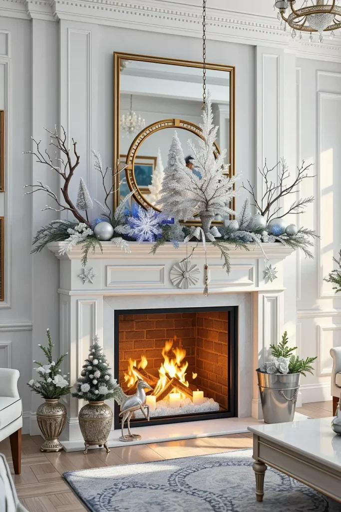 The Winter Wonderland mantle engulfs the room and changes it into a luxurious holiday retreat. I am fond of white, silver and light blue to recreate a frosty landscape. The setup is sprinkled with soft faux snow, crystal trees and sparkling lights, which makes the setup look like a magic holiday.