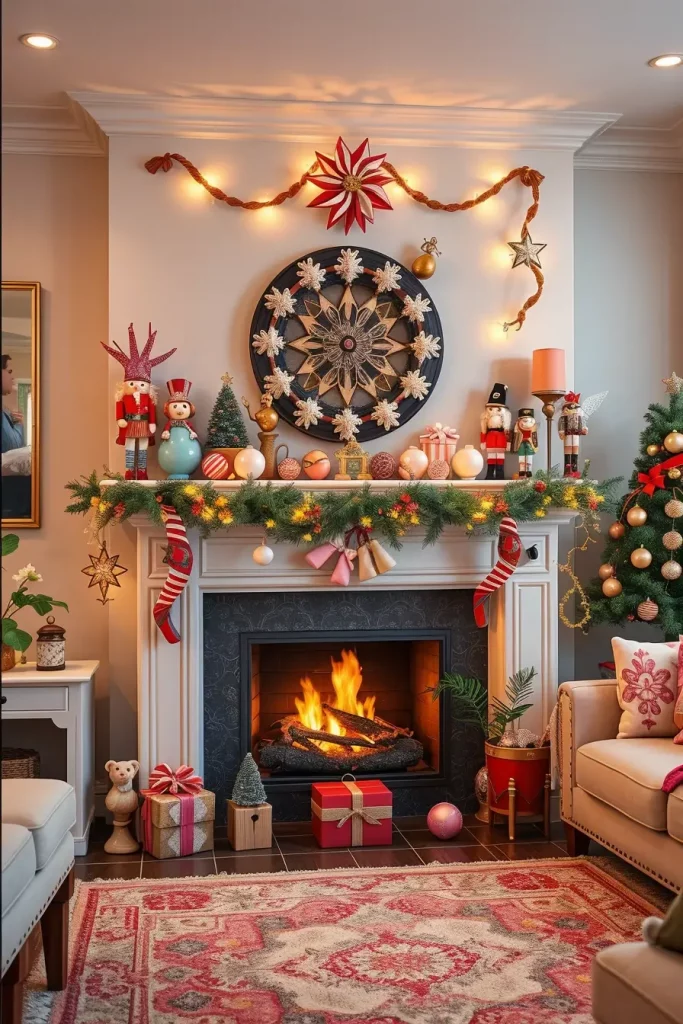 Festive Mantle Decor with Fairy Lights and Ornaments
