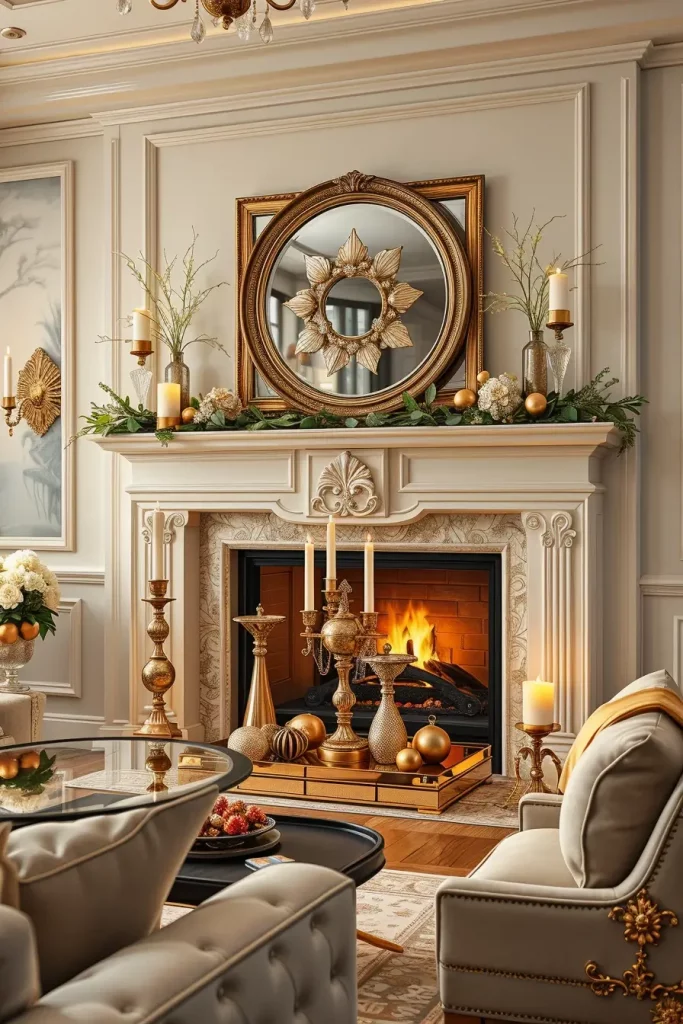 I overlay metallic candlesticks, mirror trays, and ornament clusters over the mantle to make sure that there is no competition between any of them. Combining warm and cool metals such as brass with silver enriches it and makes it more interesting to look at. The decor is augmented by a velvet or satin runner below, improving the shine.