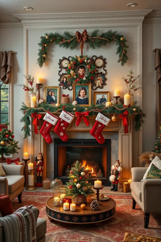 Design wise, I would like to combine a modern picture frame with a classic touch such as knit stockings or garland ties with family initials. It is a cool and yet emotional method of celebrating together and at the same time maintaining a unified mantle decor.