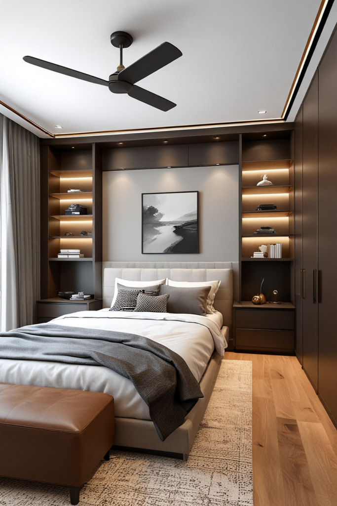 The custom built-ins and shelving solutions are practical and add a personal touch to the design of a masculine bedroom. Integrated bookcases, floating shelves, and custom cabinets artistically store books, decorative items, and personal effects while maintaining harmony with the design. This integration enhances the modern masculine bedroom concept by adding practical functionality and aesthetics.