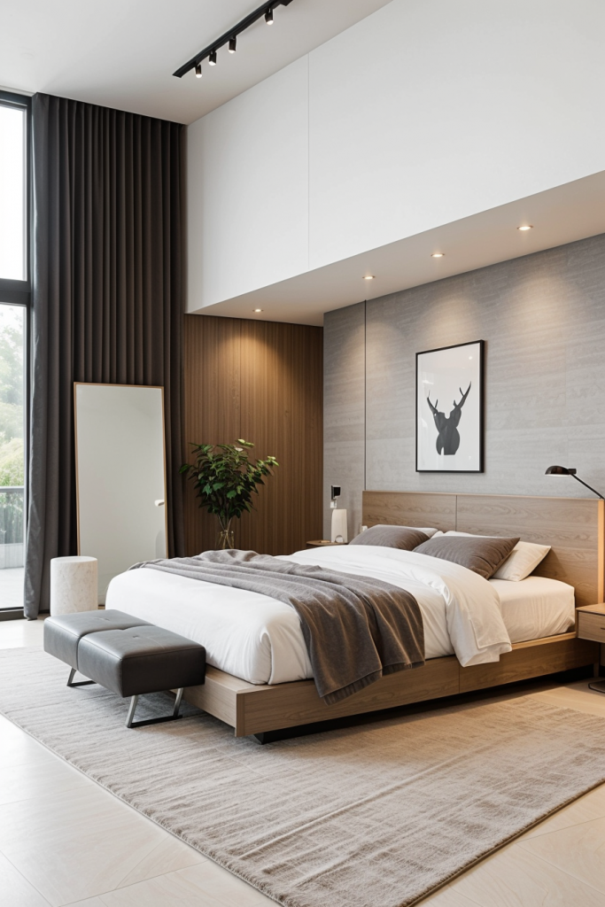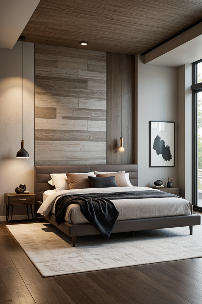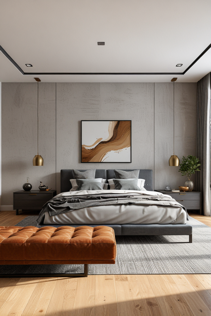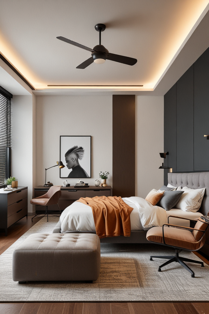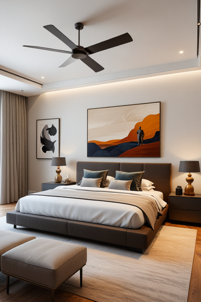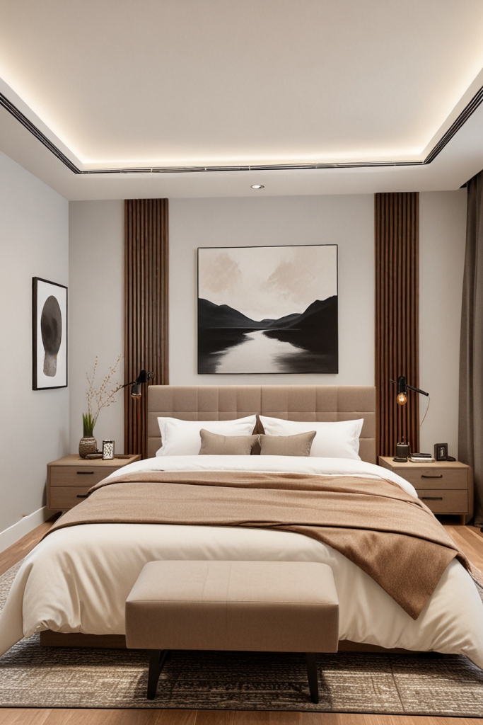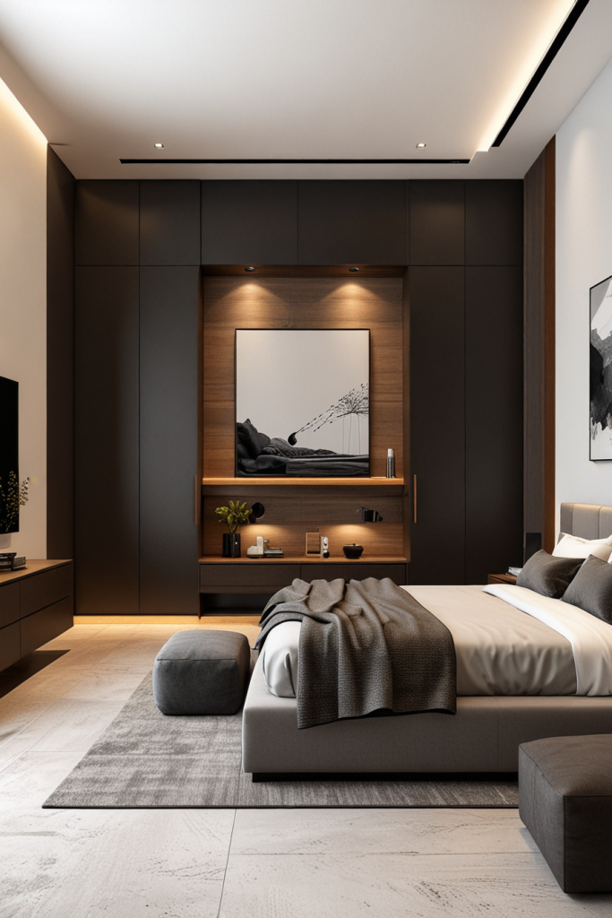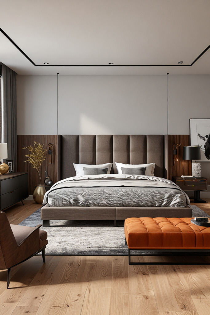 In a masculine bedroom, wall decor serves a function beyond mere adornment. It establishes the mood for the entire room. Plain walls can be transformed into stunning focal points using large abstract paintings and curated photo collage galleries. Such decor serves to balance the modern furniture and strong design features so that the space is not only motivational but also purely sophisticated.