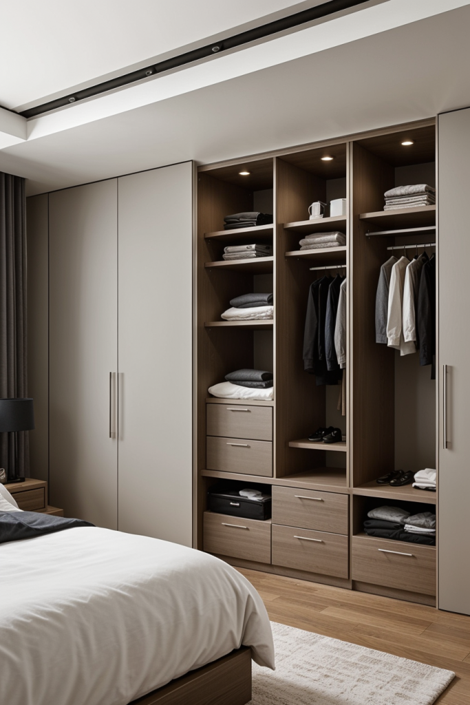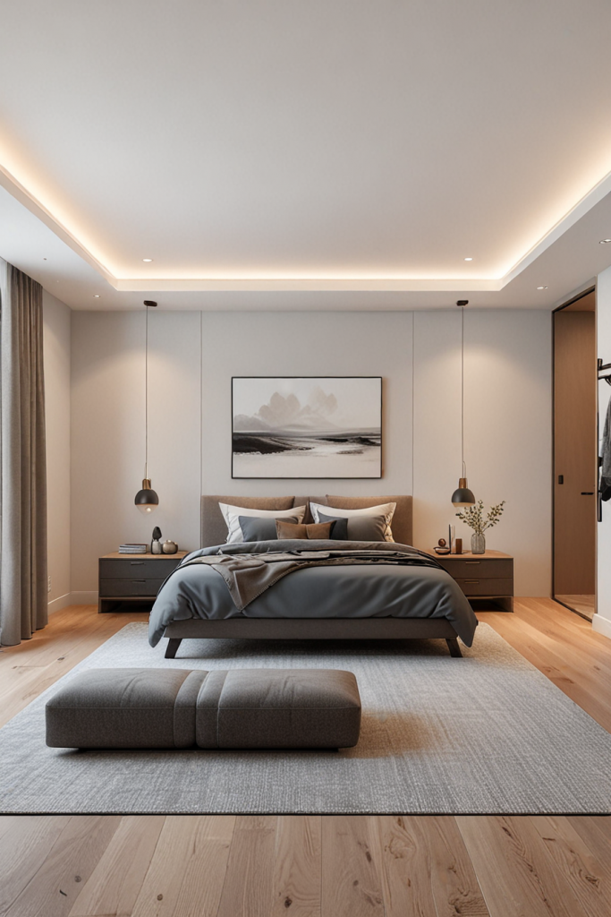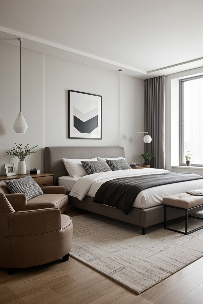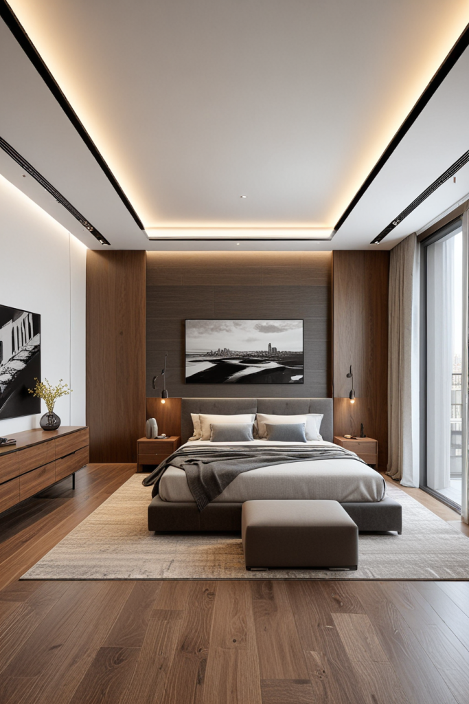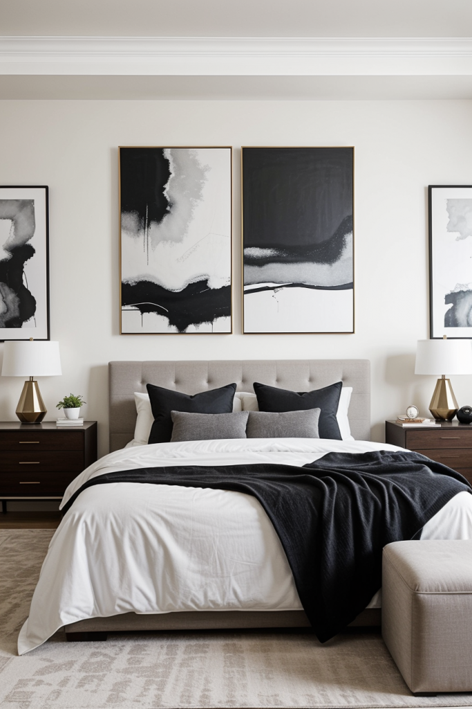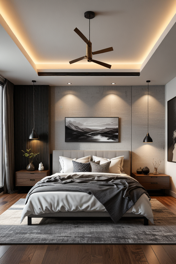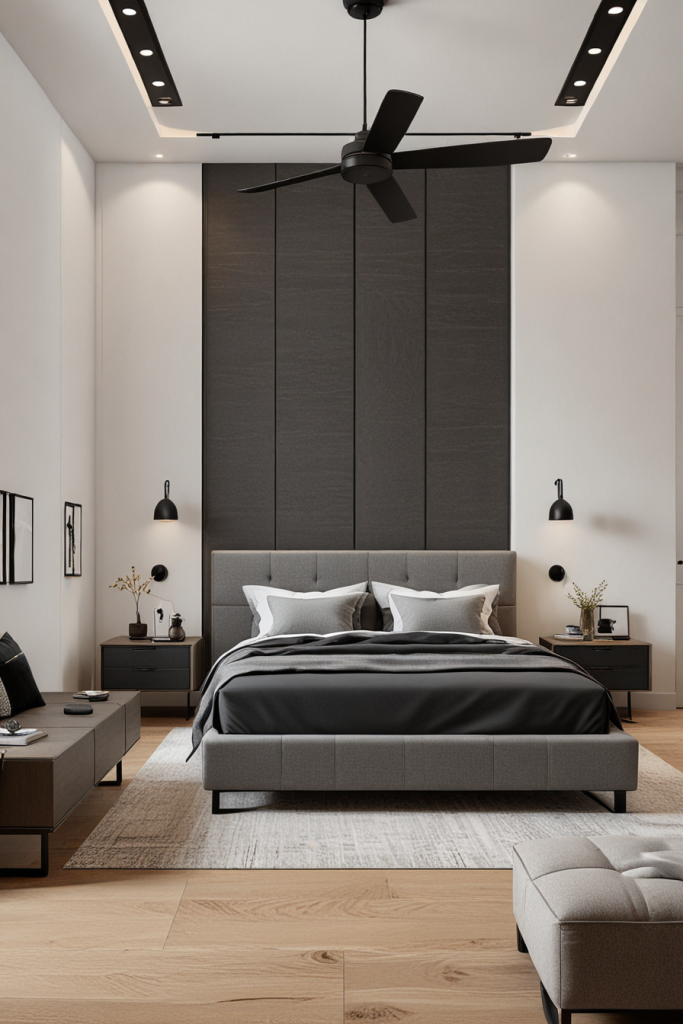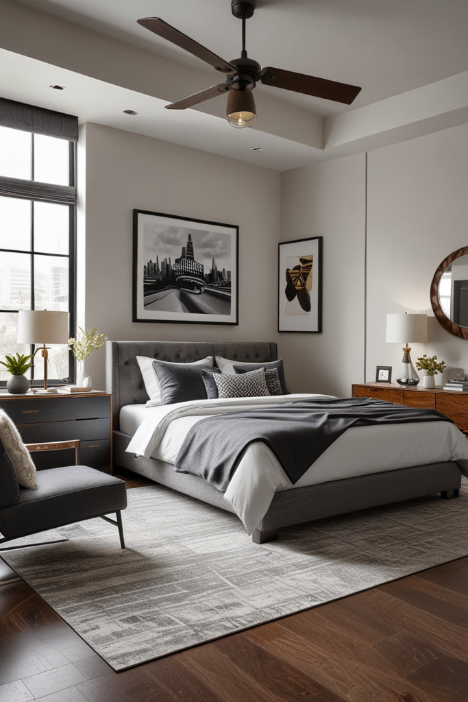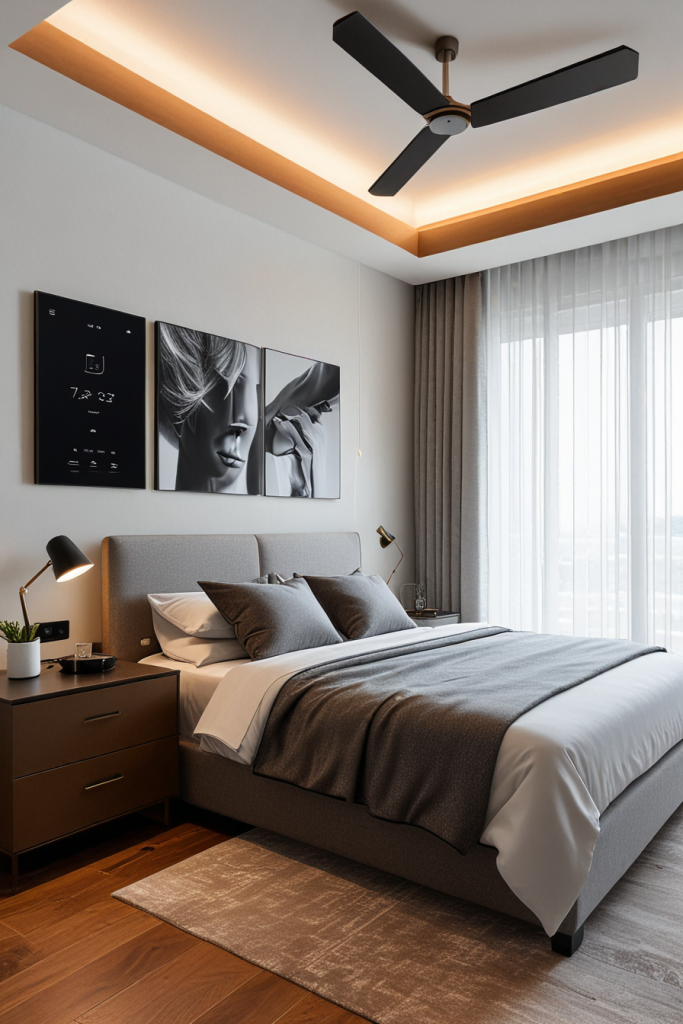 In a masculine bedroom, wall decor serves a function beyond mere adornment. It establishes the mood for the entire room. Plain walls can be transformed into stunning focal points using large abstract paintings and curated photo collage galleries. Such decor serves to balance the modern furniture and strong design features so that the space is not only motivational but also purely sophisticated.
