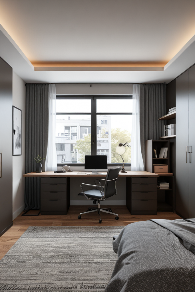 Including an office space within a male’s bedroom is a merging of work and sophistication. A basic workstation with a desk, chair, and storage area doubles as an office and a bedroom from the efficiency and style perspective. The contemporary style integrates modern masculine furniture as well as decor that gives the room a vibe distinctly modern.