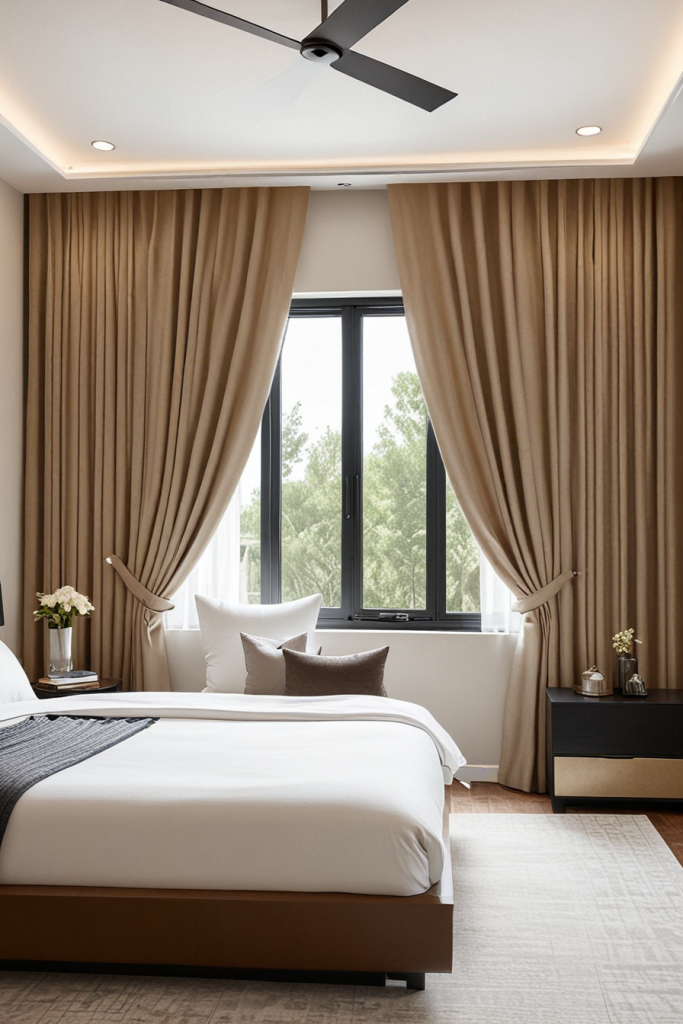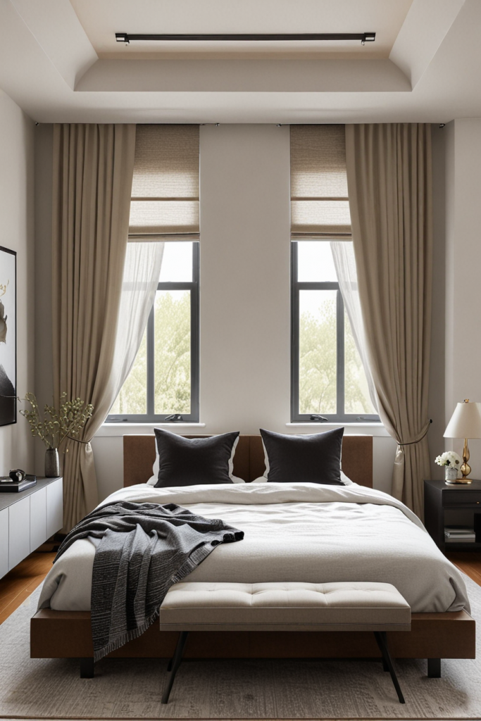 The sophisticated curtains and window treatments add a final touch to a contemporary masculine bedroom, achieving an equal balance between style and function. Contemporary furniture pieces are beautifully complemented by the room’s natural light which is filtered through tailored drapes, minimalist blinds, and modern shades, elevating the overall atmosphere of the area.
