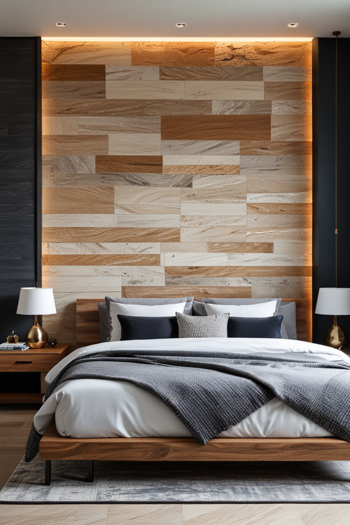 Accent walls are potent features in changing a masculine bedroom through the utilization of different textures and rich colors to form a striking backdrop. Textured stone, reclaimed wood, or patterned wallpaper are all possibilities; each of these walls brings character and dimension to the area. The room’s interplay of texture and tone makes the space feel sophisticated yet strong, which is ideal in a modern masculine bedroom filled with contemporary furniture and decor.