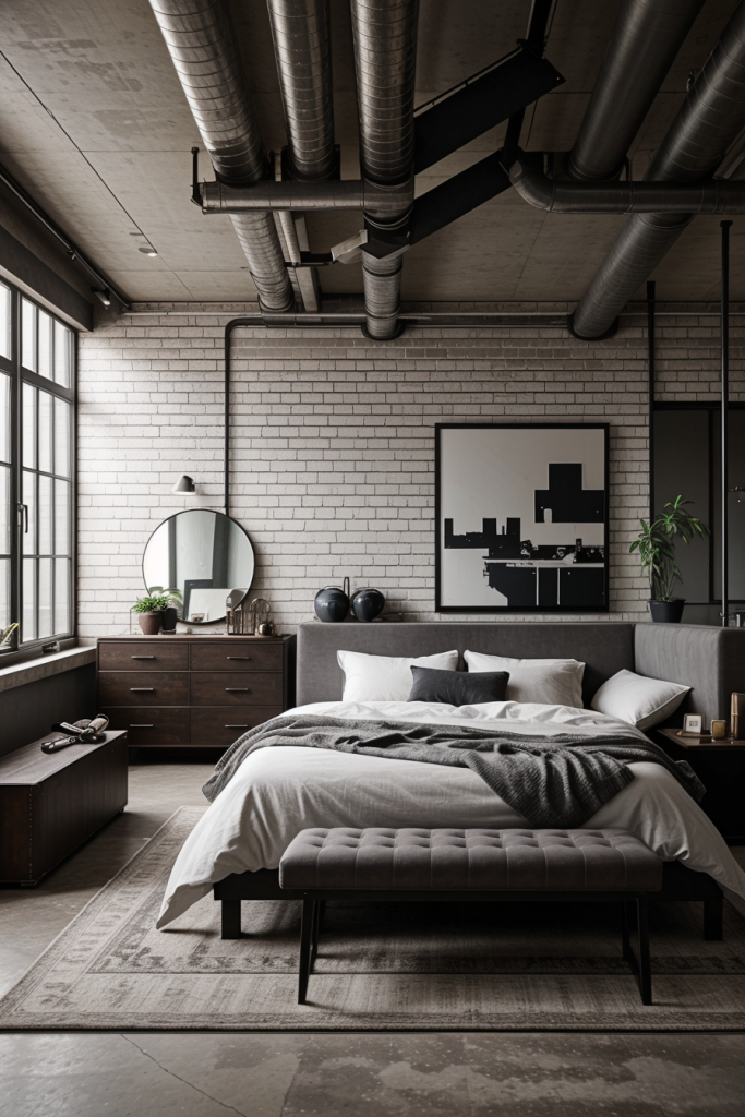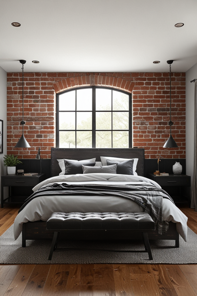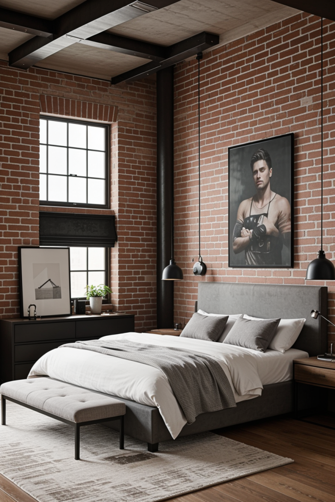 Integrating industrial design features into the decor of a masculine bedroom offers a chance to incorporate a sophisticated yet rugged style. In a contemporary exposed brick, metal textures, and other coarse materials harmonize modernistic decor for a strikingly stylish space. As the design style brings together the appeal of functionality with lavish detailing, it creates a refined strong room.
