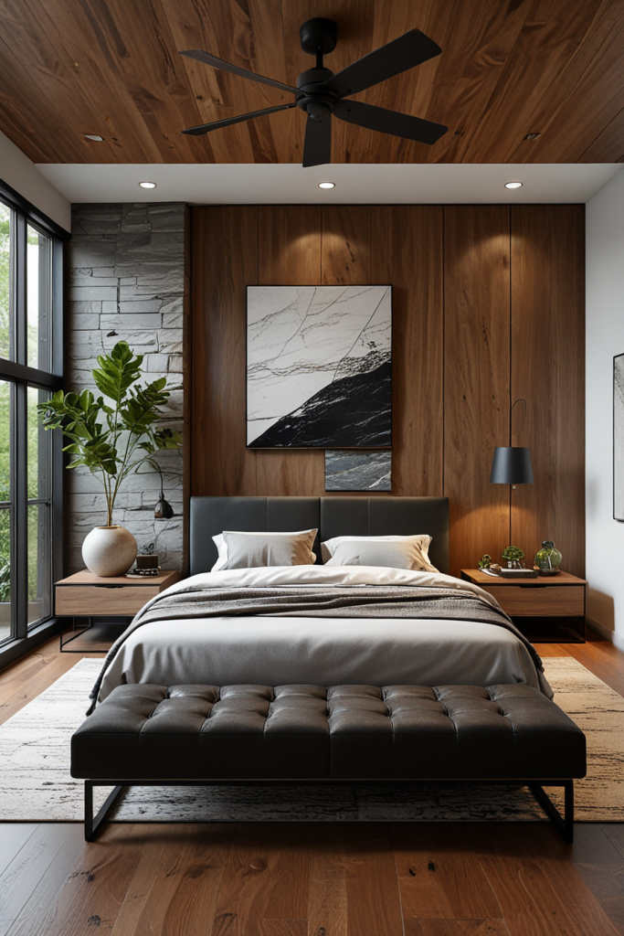 The use of natural materials such as wood, stones, and plants in a contemporary masculine bedroom adds a naturalistic touch while maintaining a modern style. When combined with modernistic furnishings, sleek modern furniture achieves a balance between natural harshness and edgy elegance.