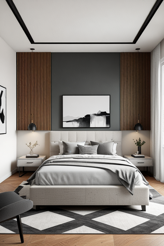 The adoption of geometric designs and sharp lines is a characteristic of modern design. When combined, these aspects enhance the structure and visual interest of masculine modern bedrooms. Furnishings and decorative pieces, as well as artwork and textile designs, are all set at harsh angles which, together with the distinctive cut edges of the pieces, capture the essence of modernism and minimalism.