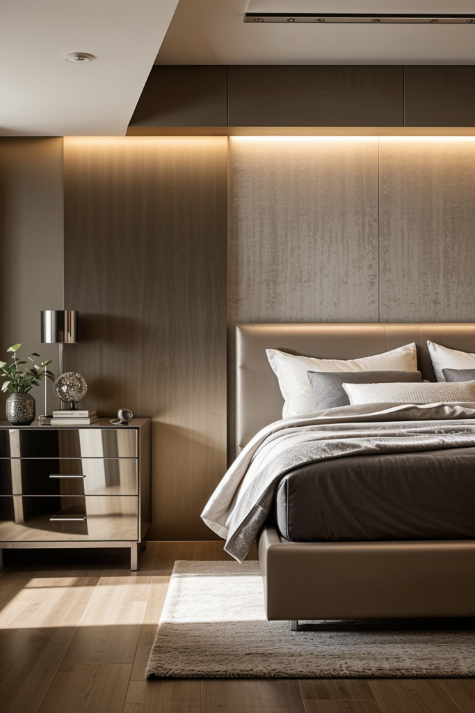 The combination of a modern masculine bedroom and metallic accents creates an industrial feel while also serving as a captivating touch. Modern furniture and decor is taken to another level with the inclusion of chrome detailing, copper accents, and brushed steel which creates a bolder atmosphere with elements of elegance.