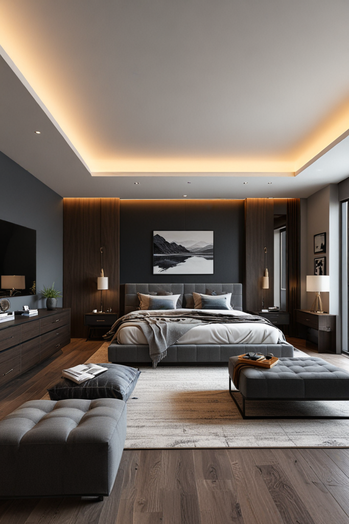 A contemporary masculine bedroom exemplifies comfort and style. It is possible to create a welcoming atmosphere through the integration of sophisticated modern furniture with plush bedding, comfortable seating, and soft area rugs. This balance guarantees that every element is practical and visually appealing, making the room’s purpose a retreat.