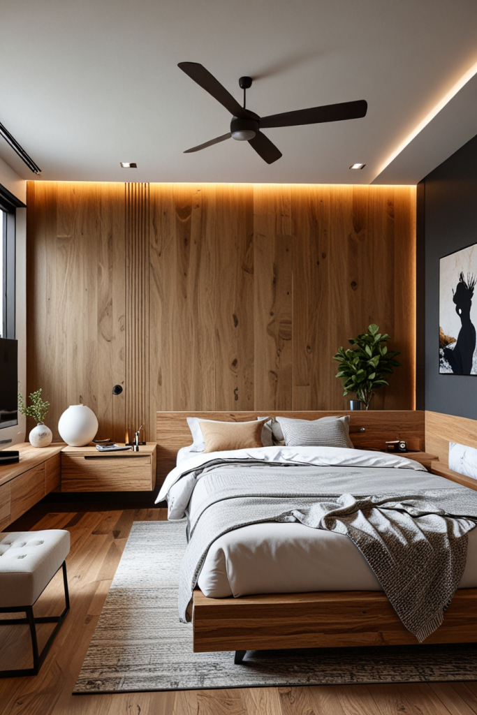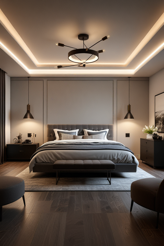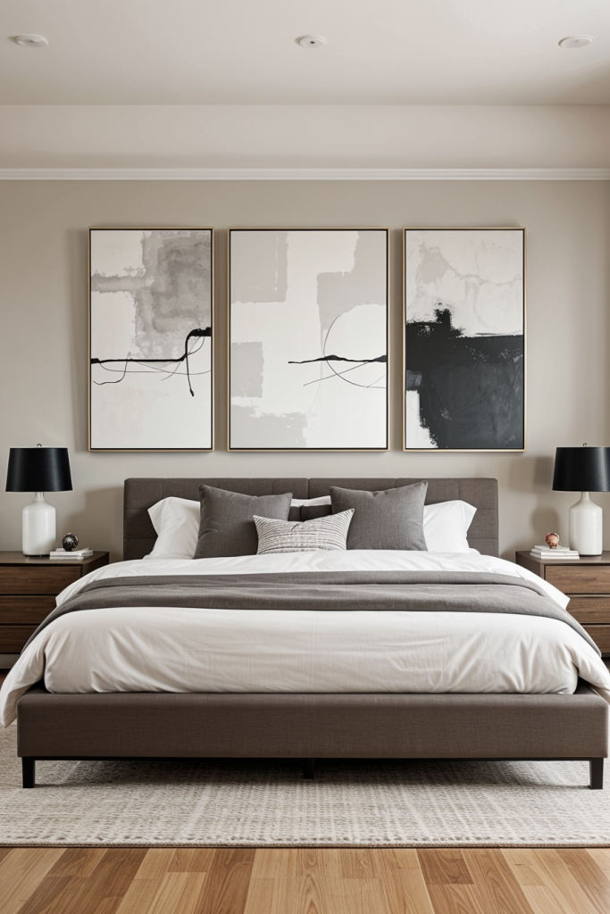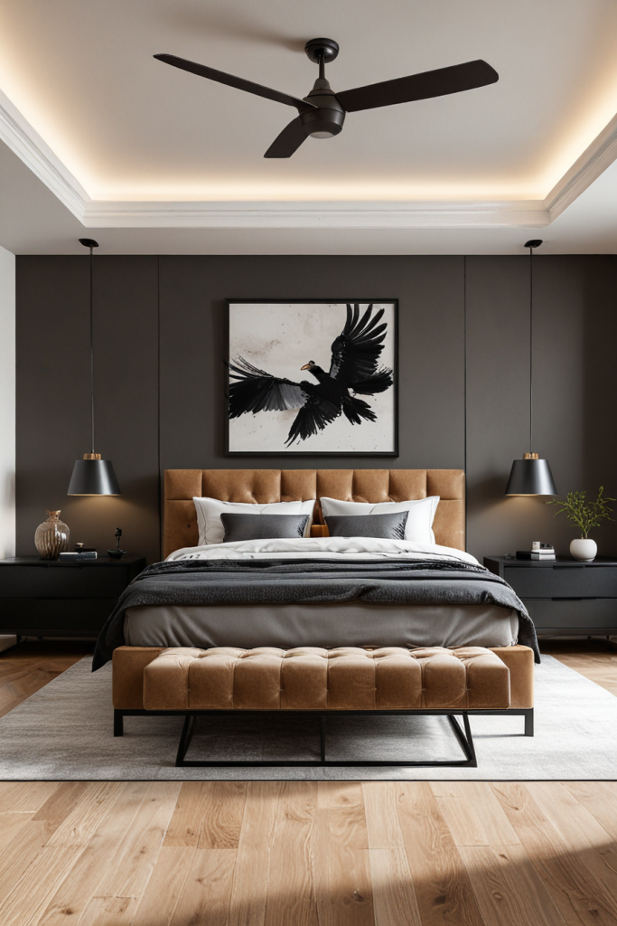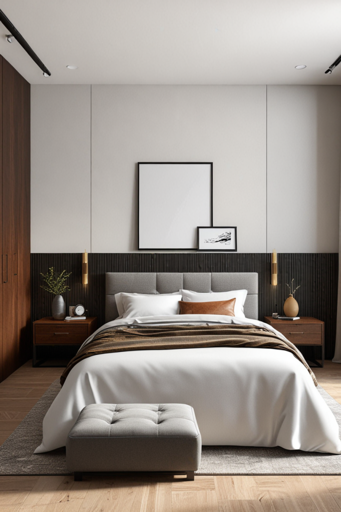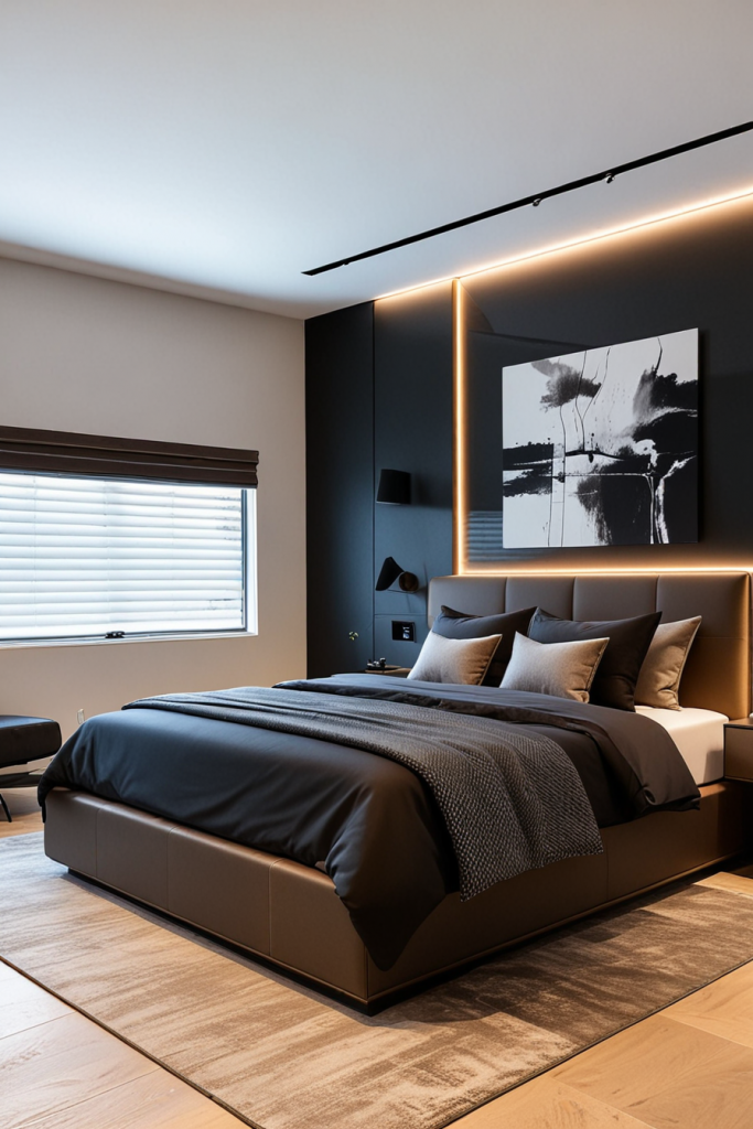 In a masculine bedroom, wall decor serves a function beyond mere adornment. It establishes the mood for the entire room. Plain walls can be transformed into stunning focal points using large abstract paintings and curated photo collage galleries. Such decor serves to balance the modern furniture and strong design features so that the space is not only motivational but also purely sophisticated.