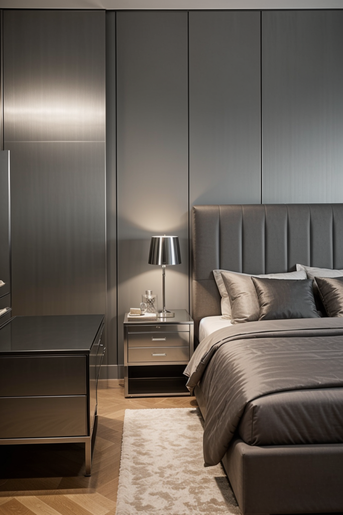 The combination of a modern masculine bedroom and metallic accents creates an industrial feel while also serving as a captivating touch. Modern furniture and decor is taken to another level with the inclusion of chrome detailing, copper accents, and brushed steel which creates a bolder atmosphere with elements of elegance.