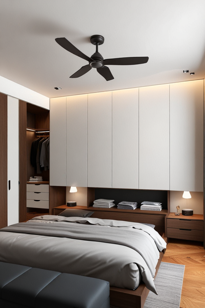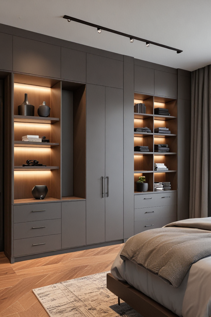 The custom built-ins and shelving solutions are practical and add a personal touch to the design of a masculine bedroom. Integrated bookcases, floating shelves, and custom cabinets artistically store books, decorative items, and personal effects while maintaining harmony with the design. This integration enhances the modern masculine bedroom concept by adding practical functionality and aesthetics.