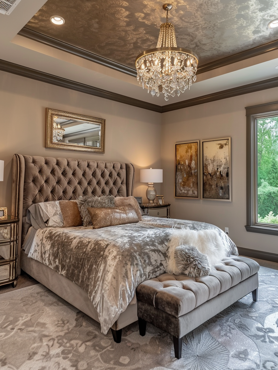 When it comes to a real luxurious master bedroom, one should really get the finest materials and some stand-out elements. With velvet, silk, and satin besides a king-sized bed displaying a tufted headboard, the overall impression is that of luxury. Adding mirrored furniture, crystal chandeliers, and high-quality artwork to the space will make it stand out further.
