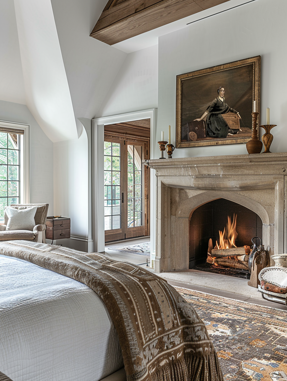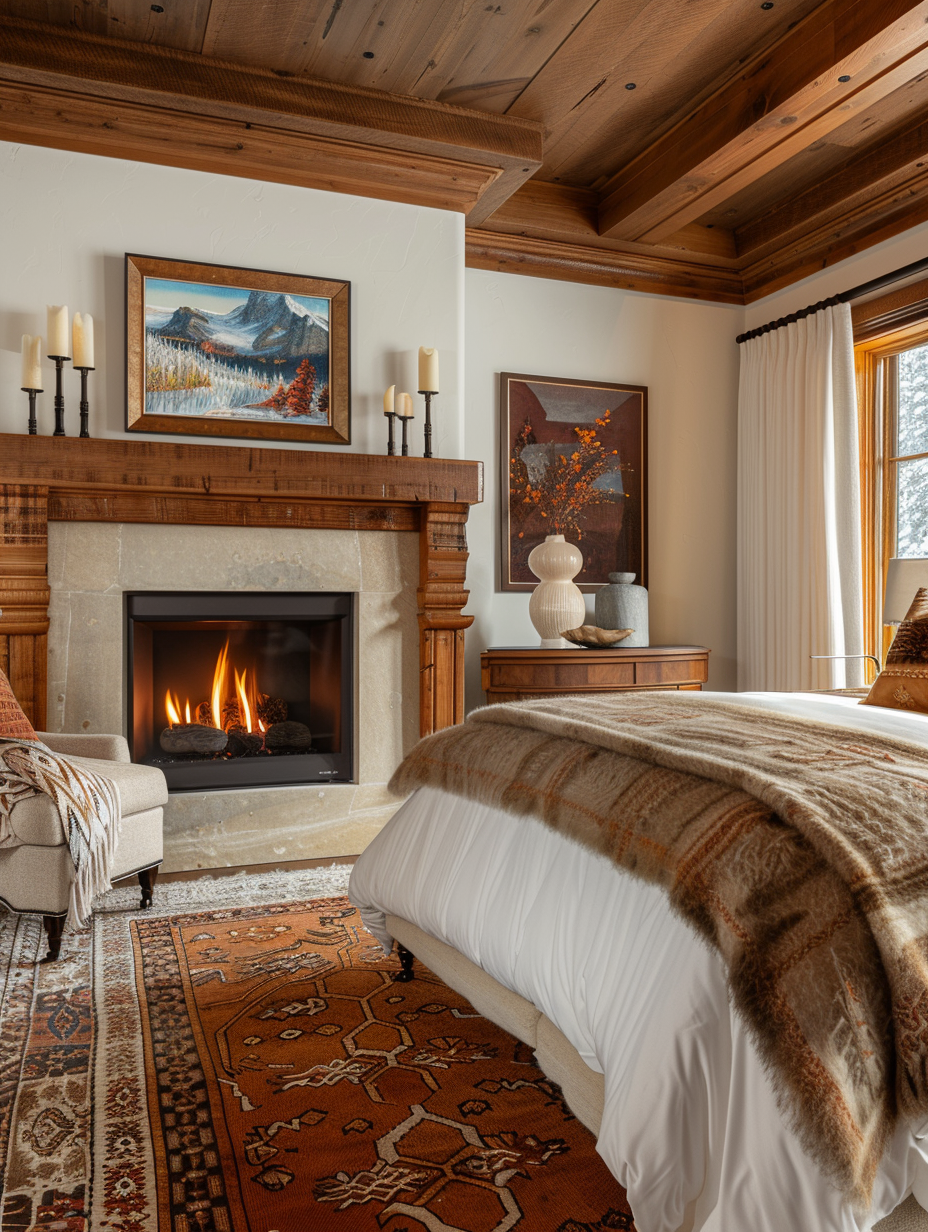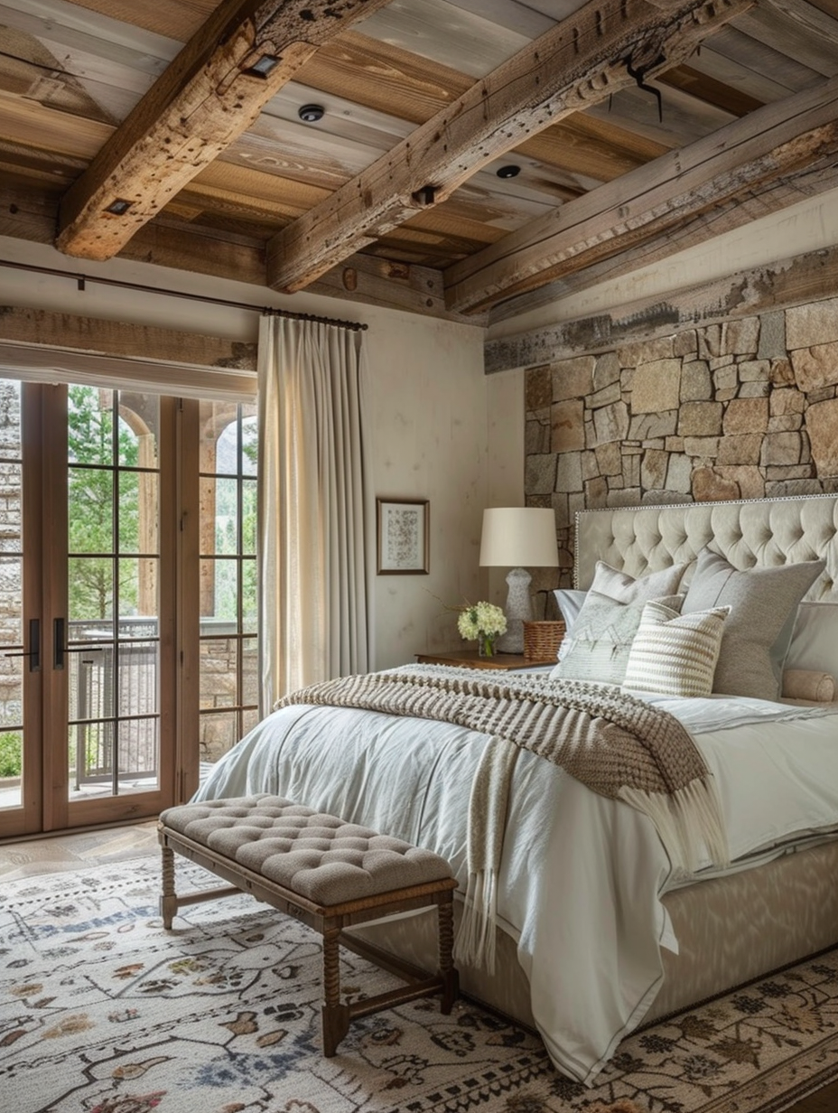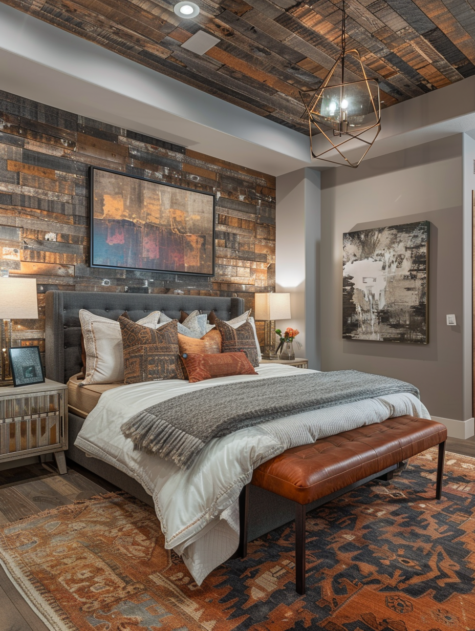 Subdued but classy master bedroom designs gain their appealing nature from the use of natural materials and earthy tones. Beautiful artworks with wooden ceilings, old pieces of furniture made of wood, and stone decor generate a feeling of warmth and coziness. Muted colors, natural materials such as linen and wool reinforced with patterns including plaid and solid fabric such as the buffalo check with less drab colors brings in the warmth and comfort.