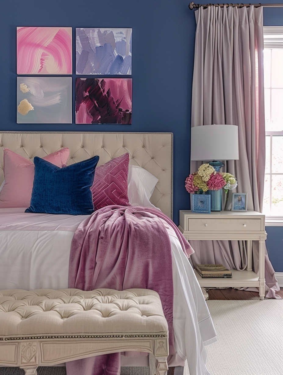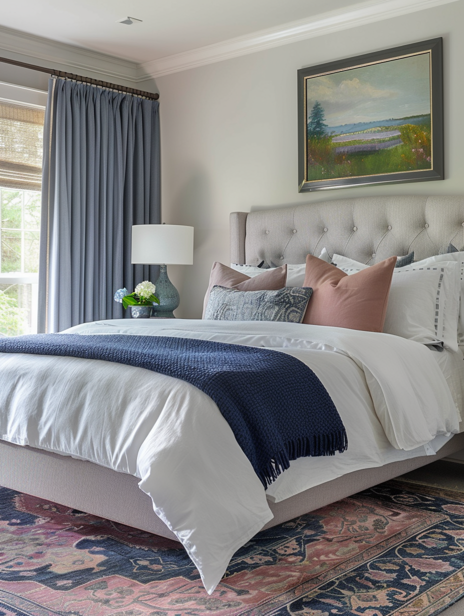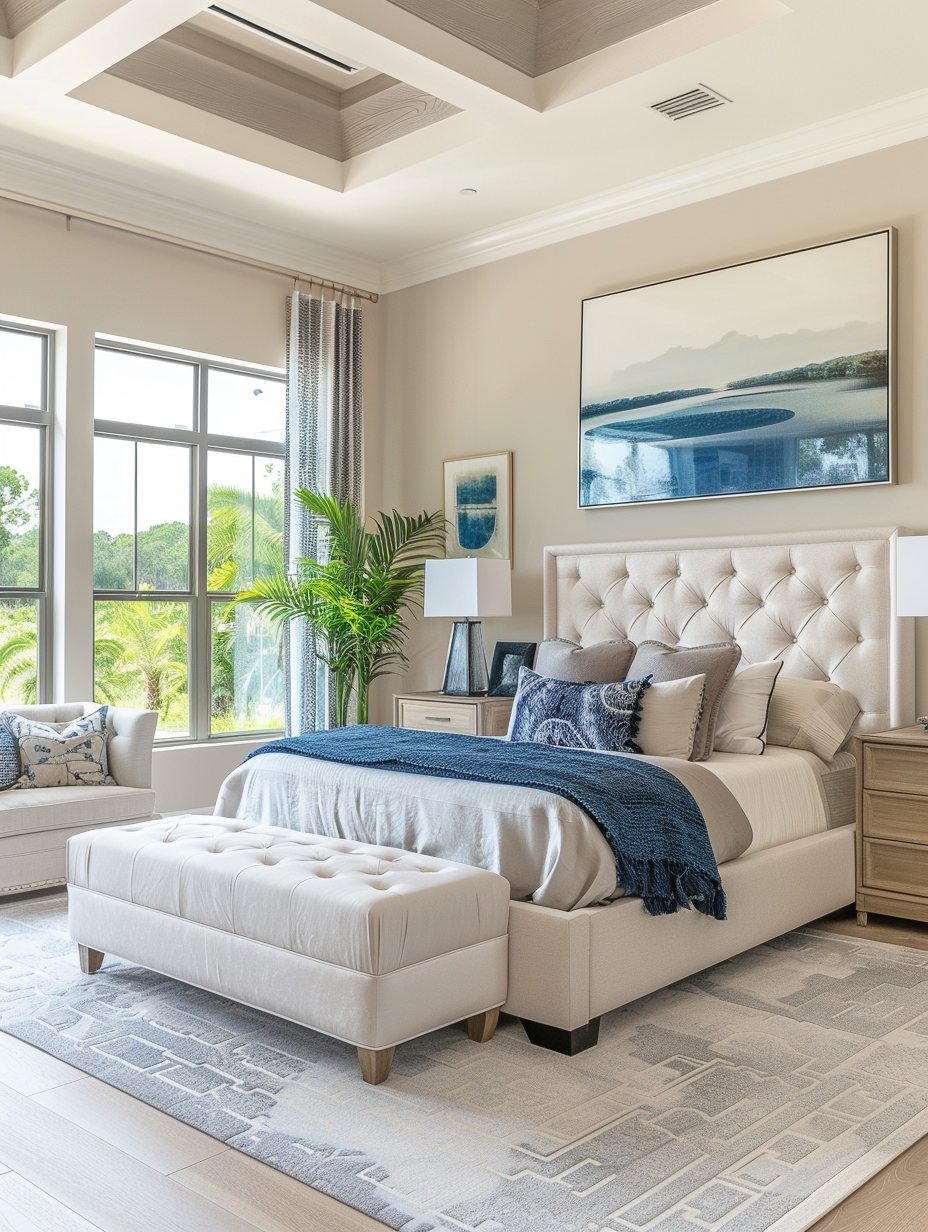 The right choice of color scheme can totally change the look of your master bedroom. From calming blues and greens that provide a feeling of peace and rest, to deep burgundies and purples that make luxury a fundamental point, a wide range of options appears. Navy and pink, navy and grey, and blue and white palettes are among the most preferable ones for their multipurpose and beautiful features.