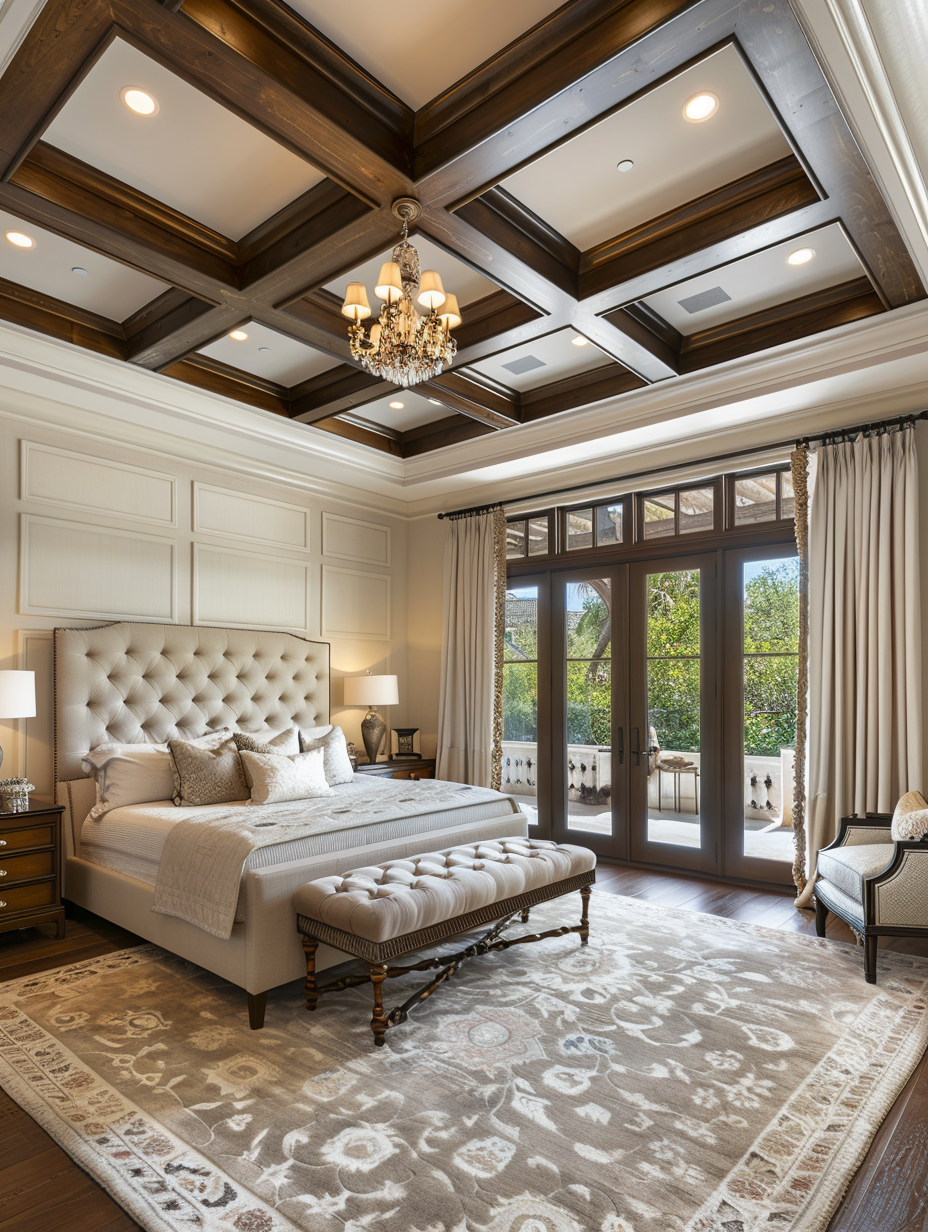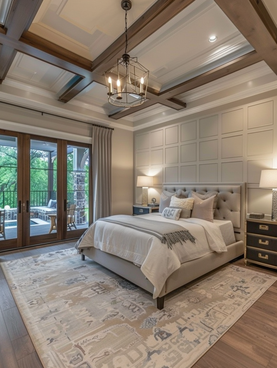 Eye-catchy ceiling styles might be a good alternative to give your master bedroom an original and dramatic feature. Cozy wood-beamed coffered ceilings and the delicate details of the moldings have the magic to spruce up the room. For a better modernist look, out of the box choice can be a statement light fixture or recessed lighting, for instance.