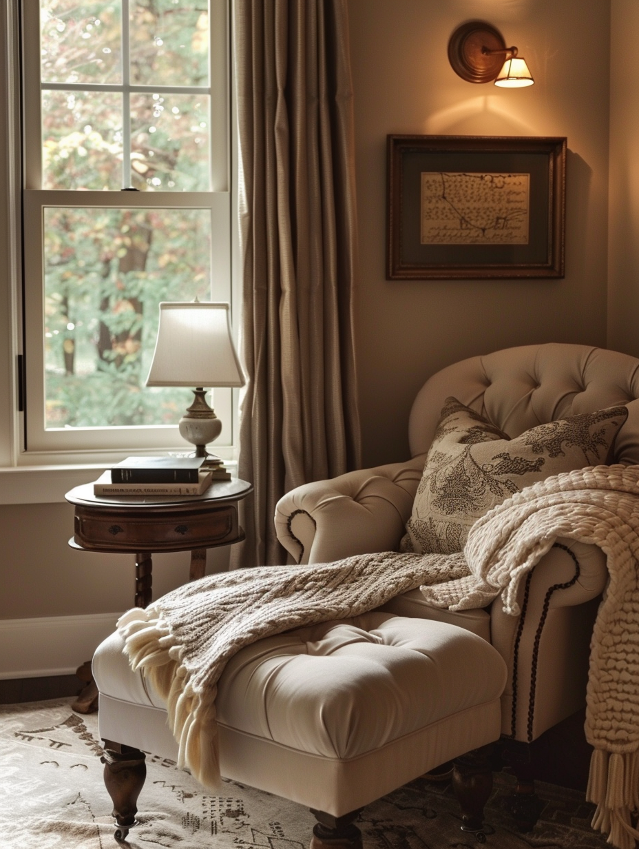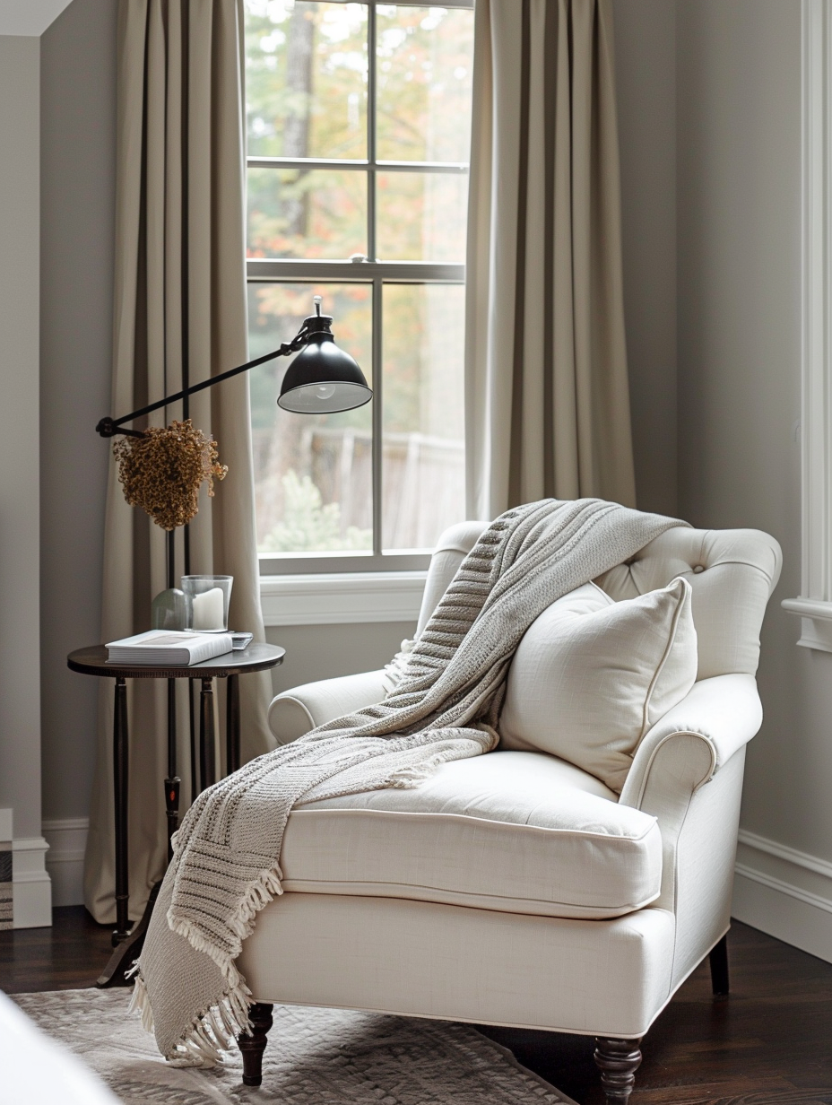 One of the best ways to create a beautiful environment in your bedroom is to make yourself a little reading nook. You can use the window to add some extra natural light, so place a cozy chair or a soft chaise lounge there! Do not forget a little side table, a floor lamp, and one warm throw blanket to make it look perfect homeless.