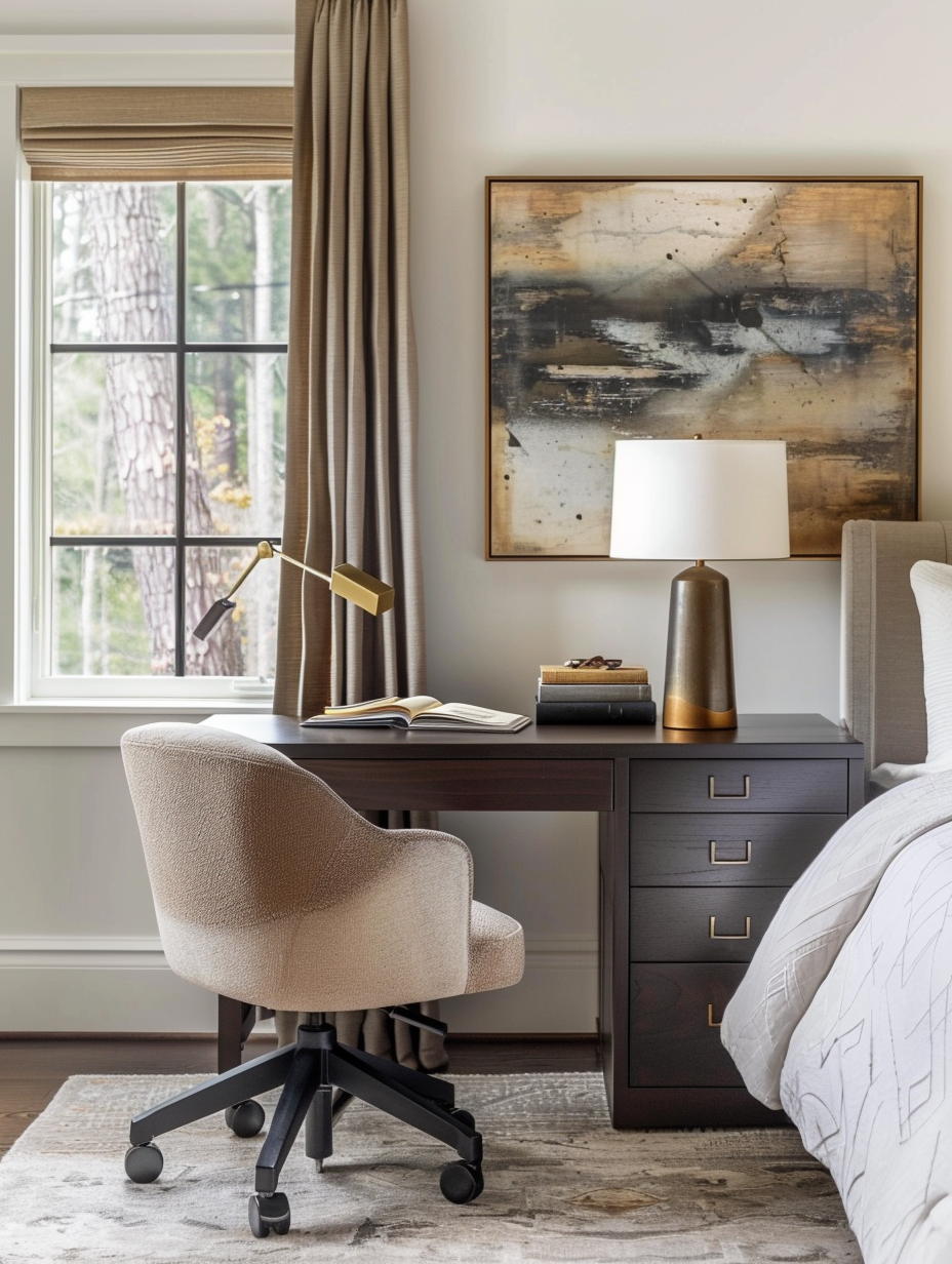 An office station incorporating a plain yet ergonomic space in your master bedroom can make the room more productive and still keep it beautiful. First, get a desk that is parallel or compatible with your bedroom furniture and a comfortable chair. to be your office seat. Make good lighting a priority, and consider adding artistic items through a fashionable desk lamp, artwork, and organizational accessories.