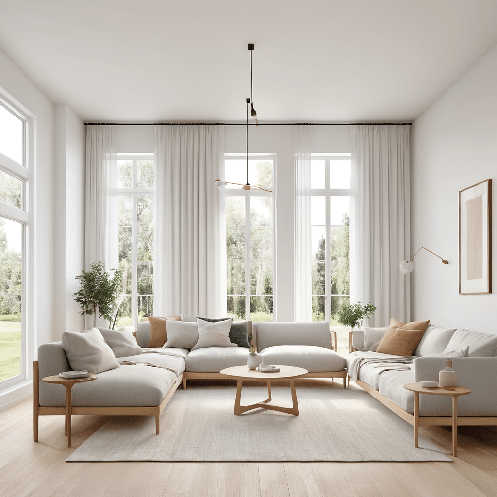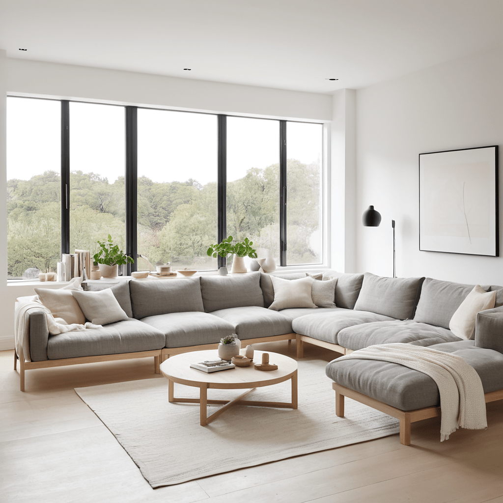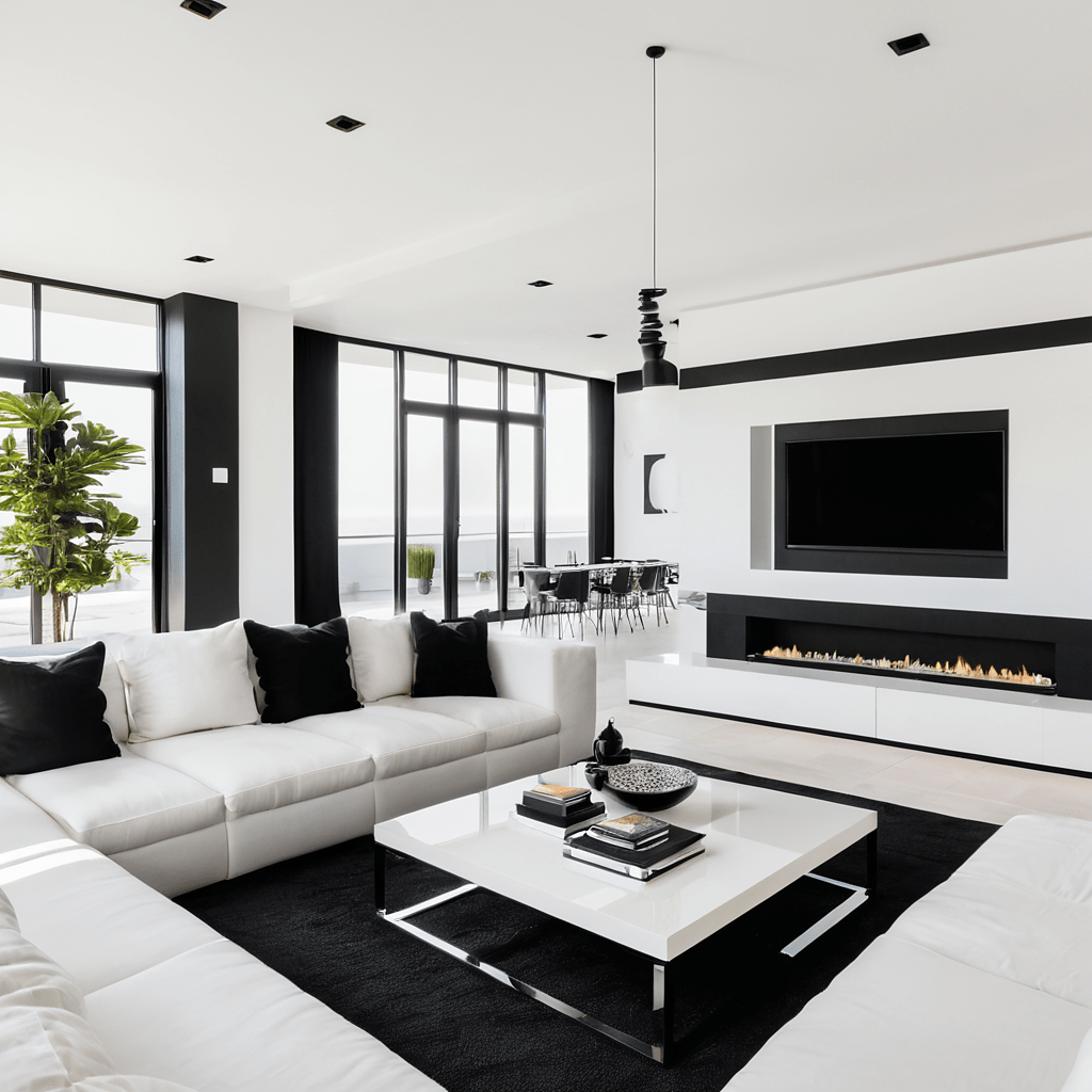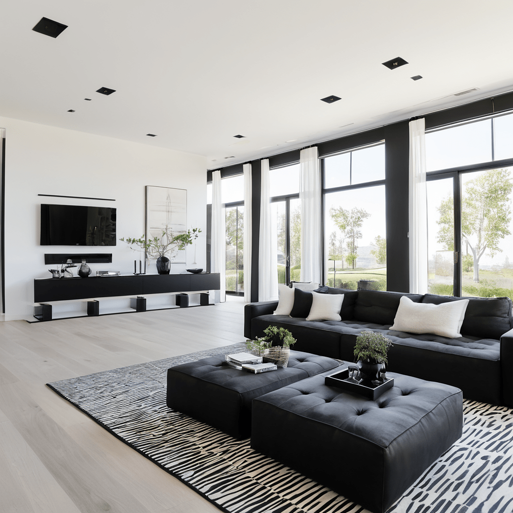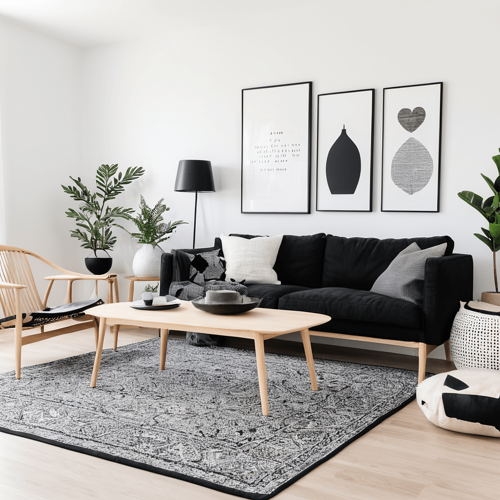 A Scandinavian minimalist living room with black accents combines the simplicity of Scandinavian design with the striking character of black accents. Oftentimes this style features light wood furniture, white walls, and black elements that add contrast and sophistication. The black accents could be in the form of furniture, light fixtures, or decor items, which together make a bold yet harmonious look. The overall effect of the room is a space that feels both cozy and modern, with a touch of Scandinavian elegance.