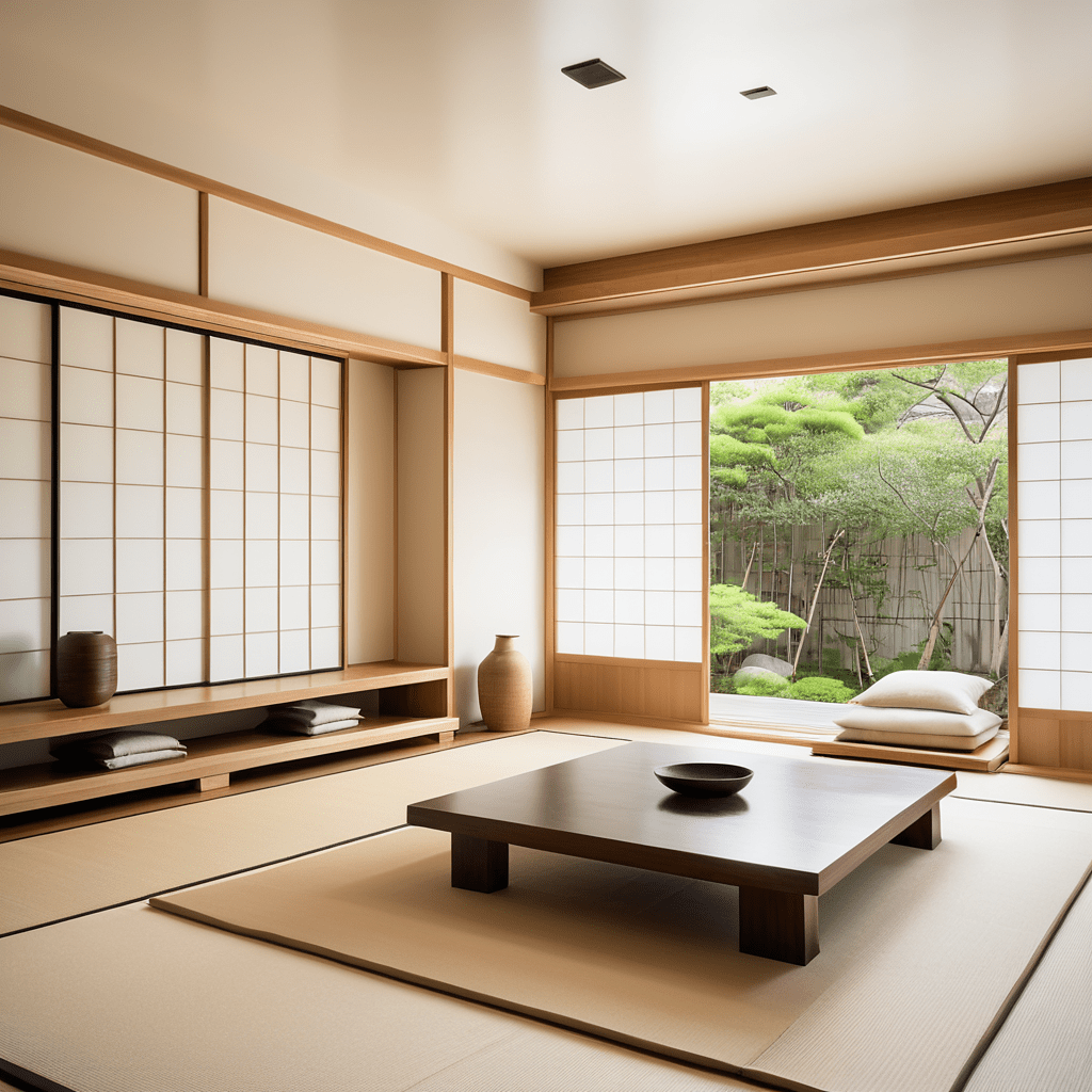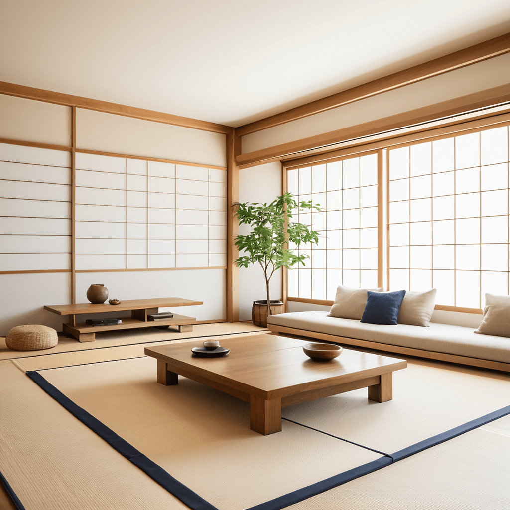 A Japanese-inspired minimalist living room is based on the principles of Zen focusing on simplicity, natural elements, and harmony. The design style often includes low-profile furniture, sliding shoji screens, and natural materials like wood and bamboo. The palette generally consists of desaturated shades of color with texture. The entire room is very peaceful and balancing, so it can be utilized for meditation and relaxation. This style is a great choice for those who love minimalism and nature’s soothing force.