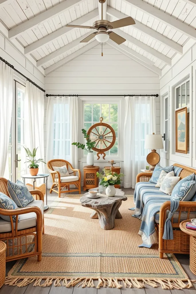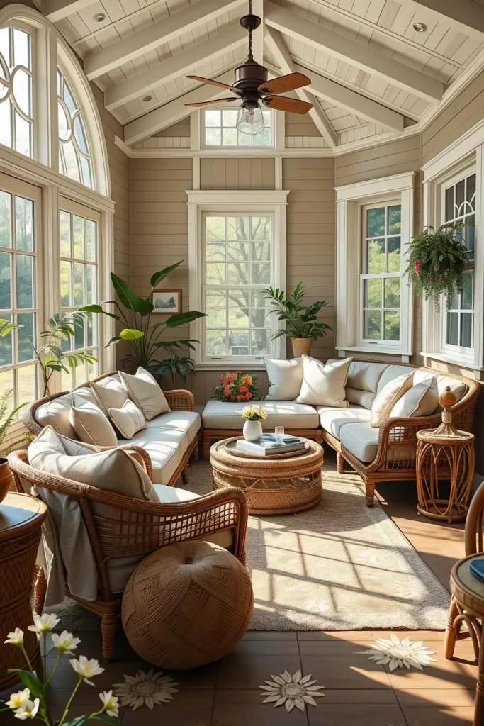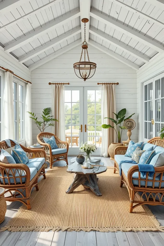 The sunroom that was inspired by the coastal flair cannot be compared to any other thing. I prefer the way the style is so peaceful with natural textures and sea colors. I do this by applying soft blues, white and sandy beige colors that are combined with driftwood-style furniture. The textures made of whitewashed walls contribute to the casual atmosphere.