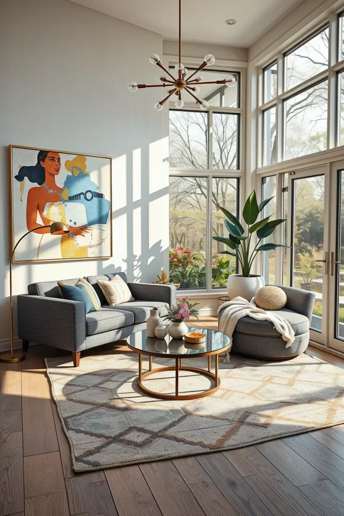 In designing the layout, I tend to use clean-lined furnishing and leave the artwork to shine. Imagine a sofa in the charcoal color and a geometric carpet, or the gallery wall to be displayed and featuring local artists. A glass coffee table that is decorated with metal finishes completes the appearance. The lighting is a major consideration, in a floor lamp with an arched base of brass is both cozy and fashionable.