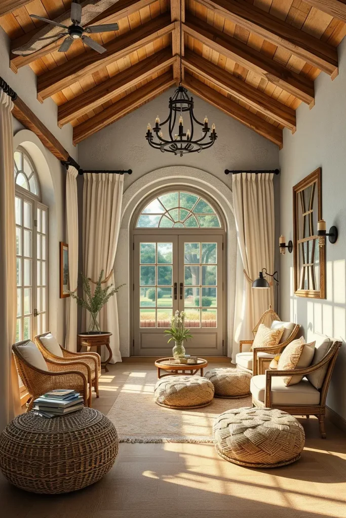 In my cases, I mostly preserve the original architectural features, such as wooden beams or brick decorations, and replace the flooring with tiling or vinyl tiles. The inviting and modern space is achieved with the help of furnishings, i.e. wicker chairs, squishy cushions, and neutral throw blankets. A pendant light or sconce can just be added to the room to add some style to the room immediately.