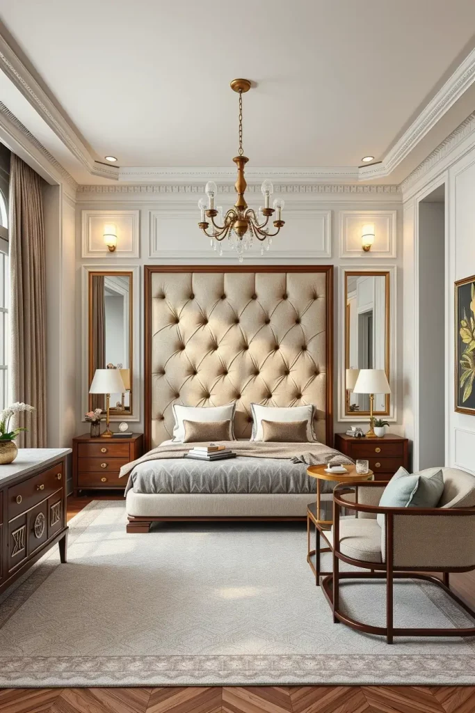 Every object in such a bedroom is critical. The neutral tones of a tufted upholstered headboard help give the design a foundation and a warm feel is provided with a sleek walnut dresser. To bring the old and the new closer, I frequently use marble topped nightstands, and brushed fixtures made of brass. The floor-length curtain and the sparse art objects are all mature.