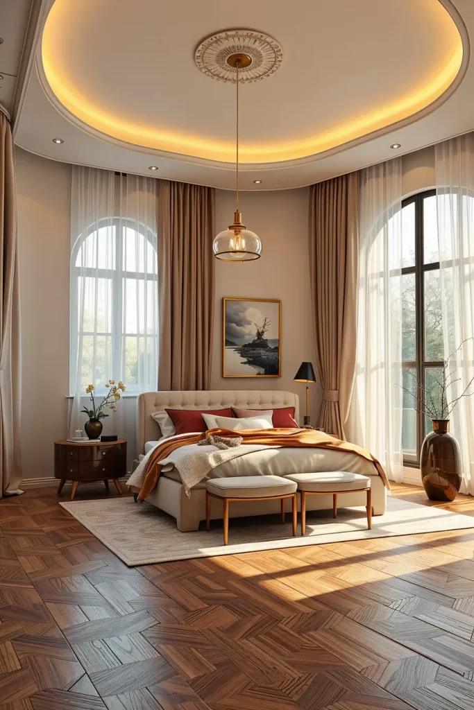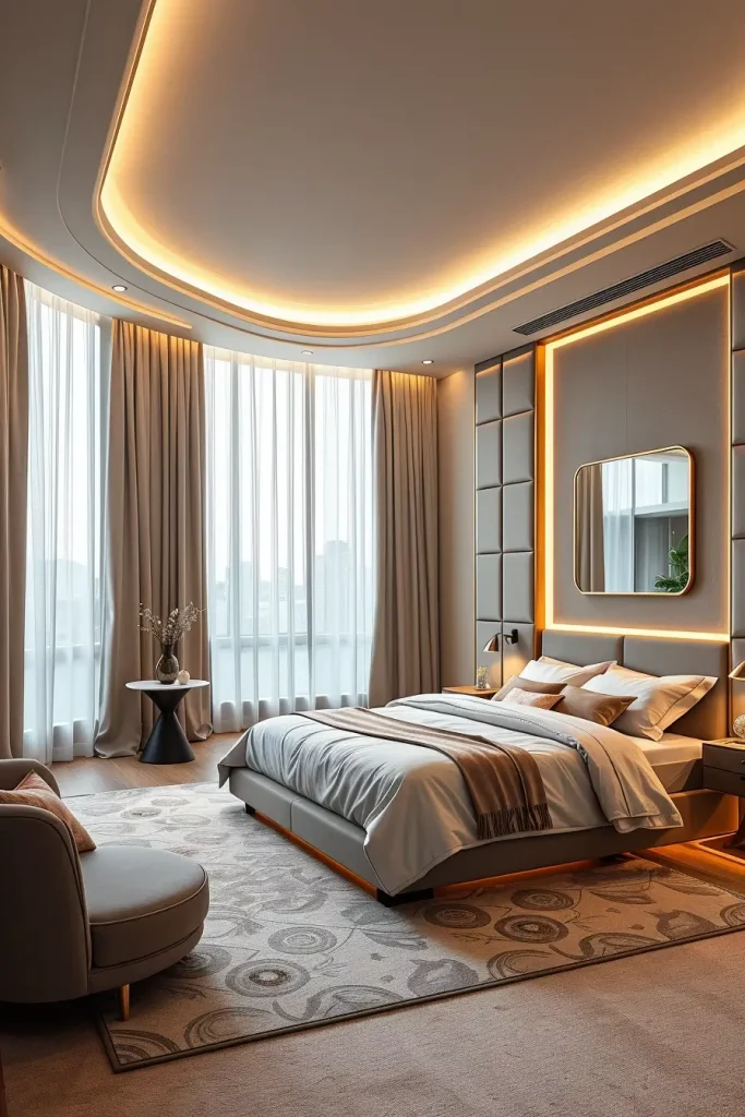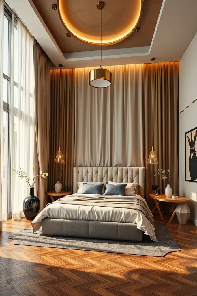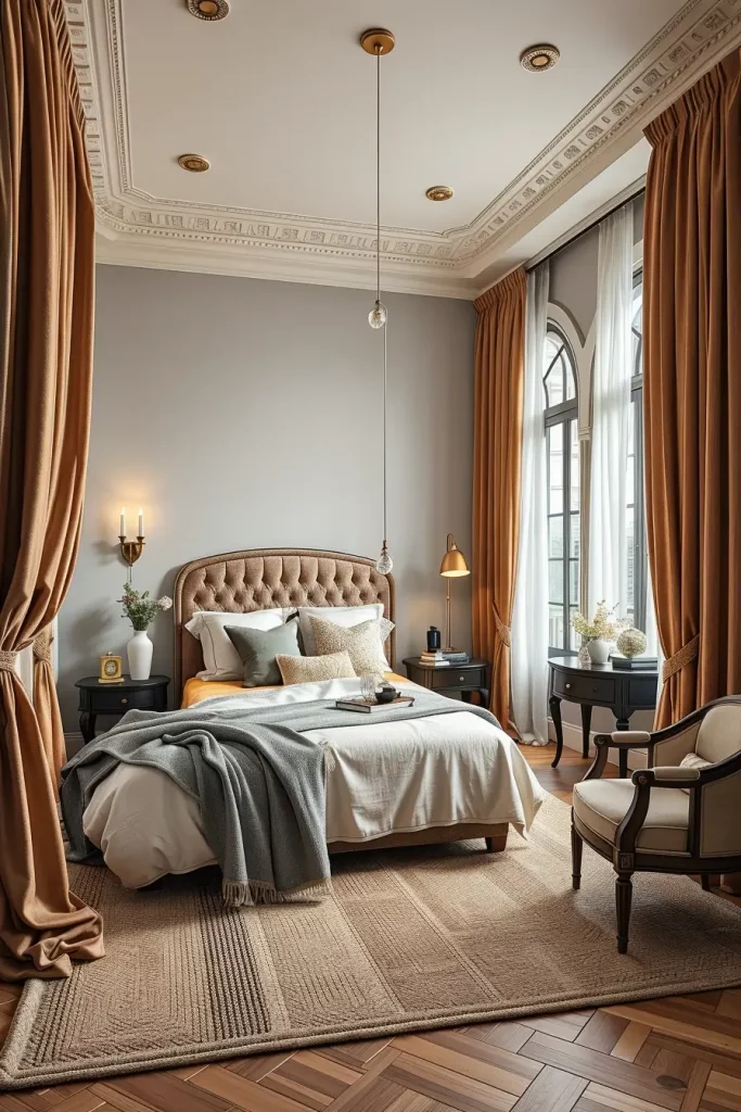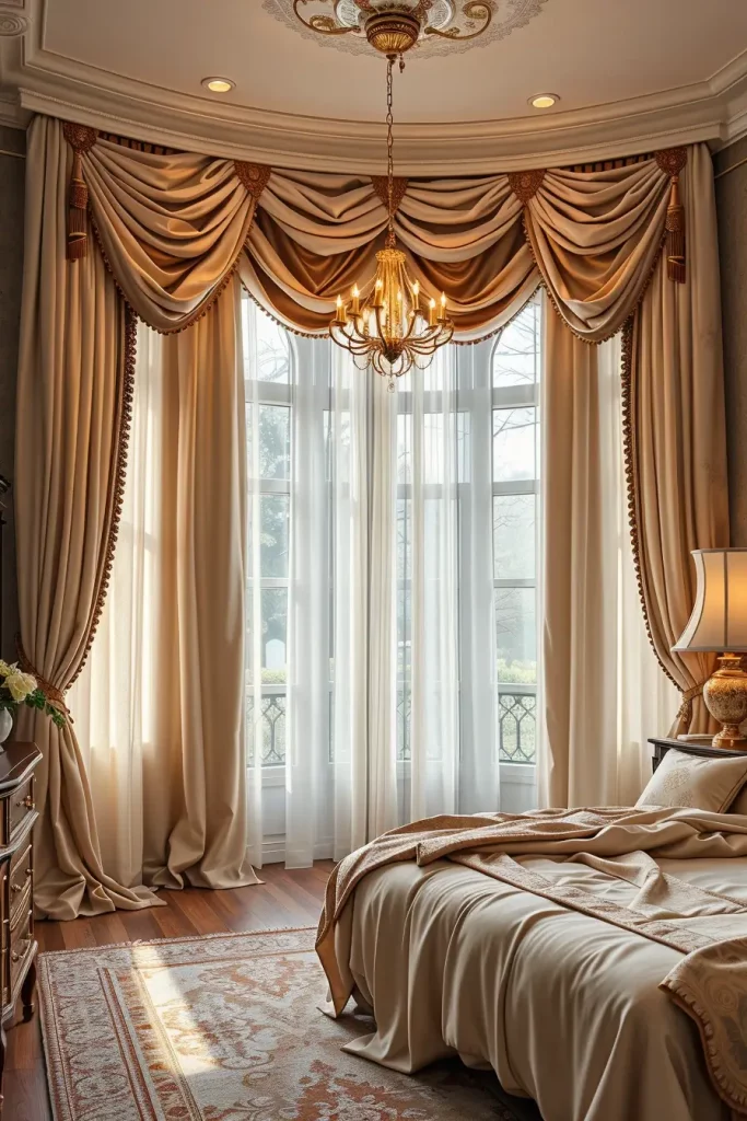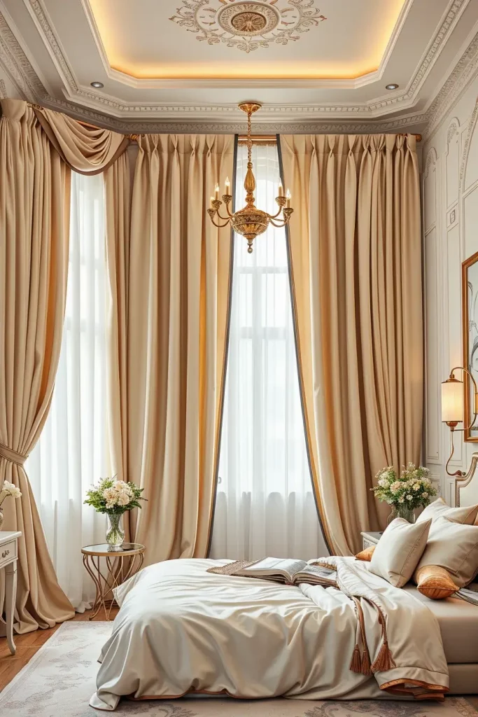 In elegant bedroom settings, curtains are very vital in the description. I tend to wear full-length and flowing dresses in neutral colors such as ivory, champagne, or gray. Not only do they make things taller and more graceful, but they also make one feel at peace. The combination of sheer and blackout curtains give beauty and functionality.